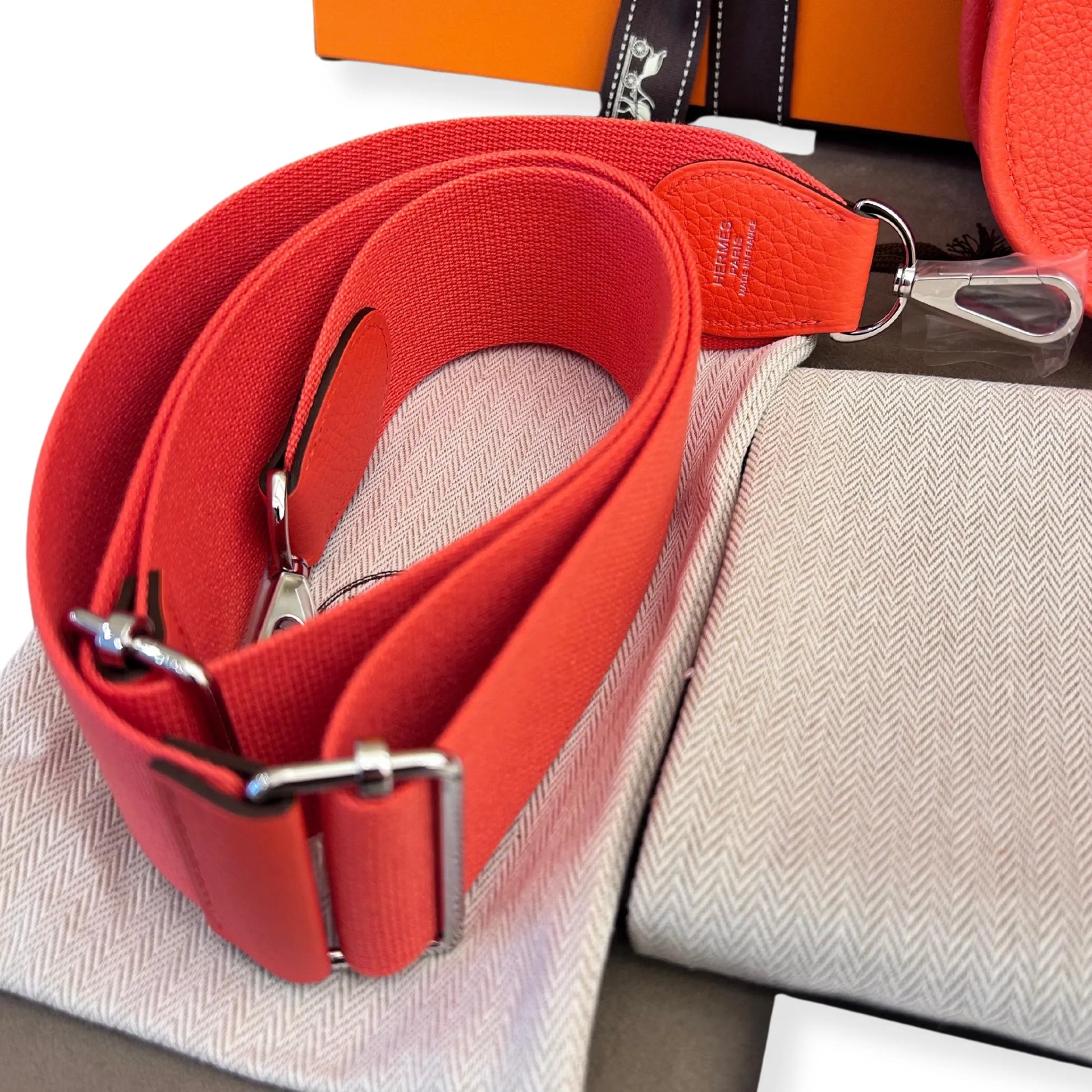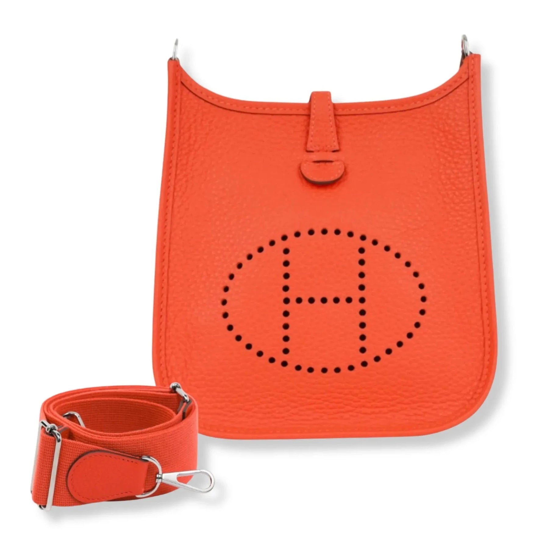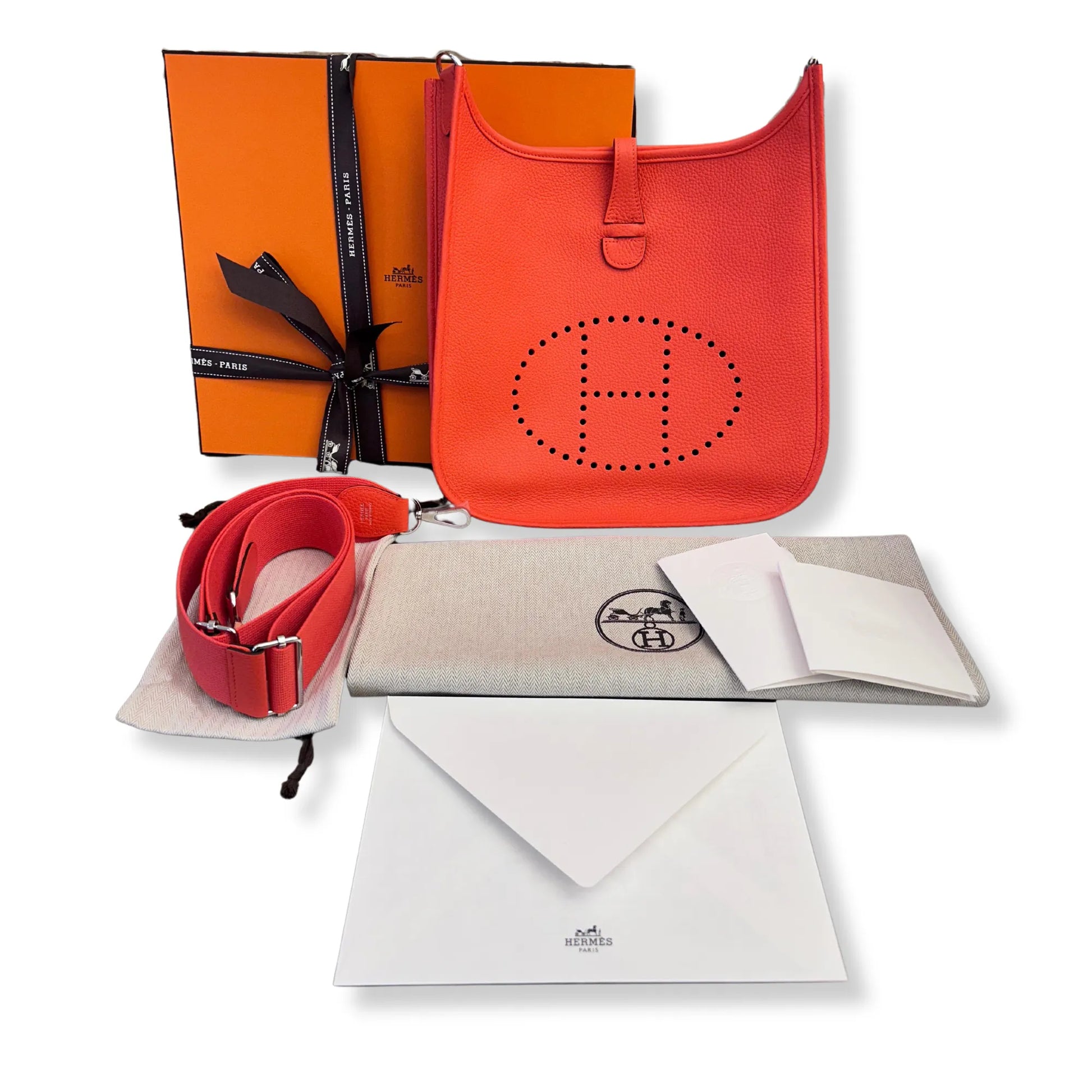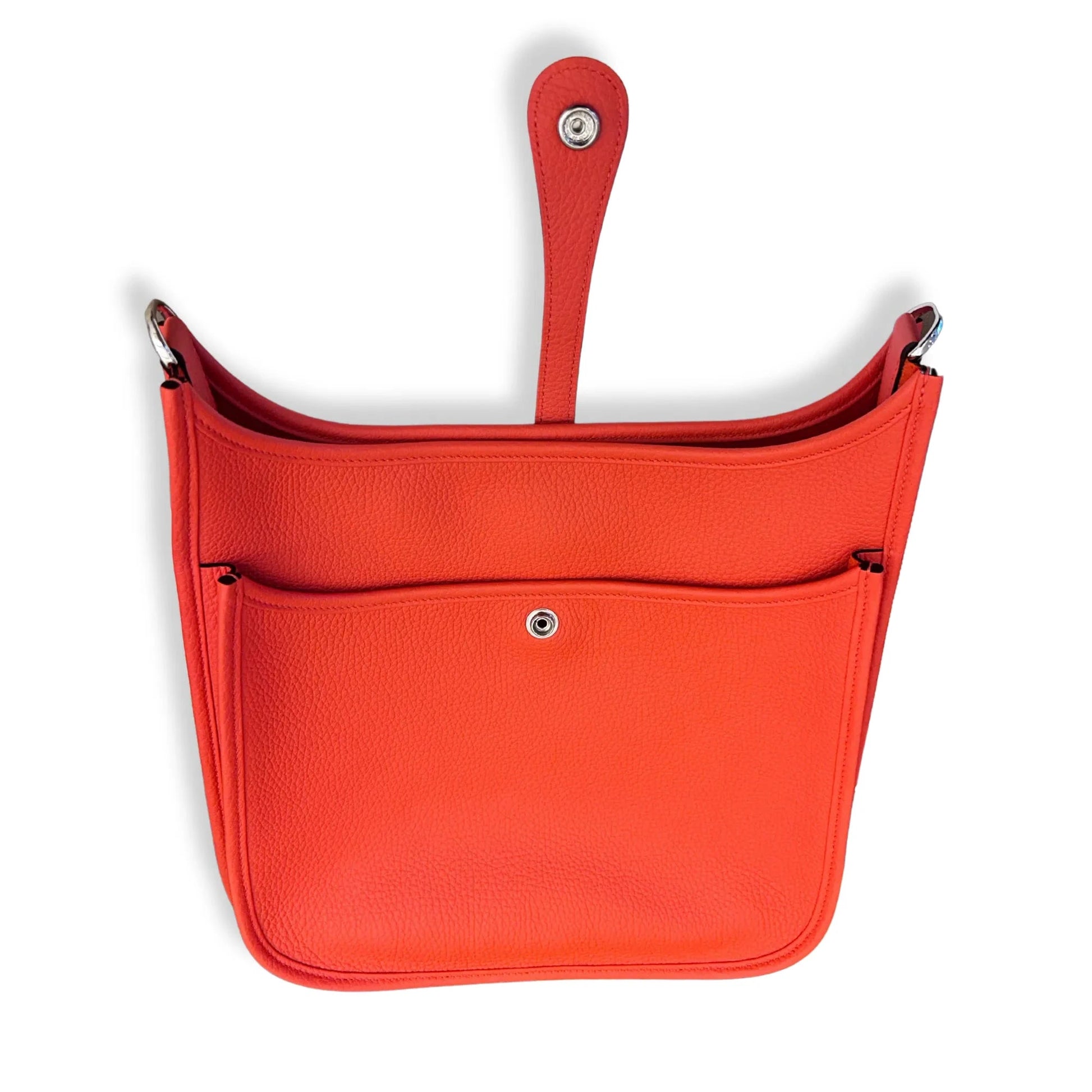 New Hermès Evelyne III 29 Orange Field. This exclusive Orange Field Clemence Leather in Orange field with a shoulder strap made out of the same leather and tone. The details are made of Palladium Hardware.