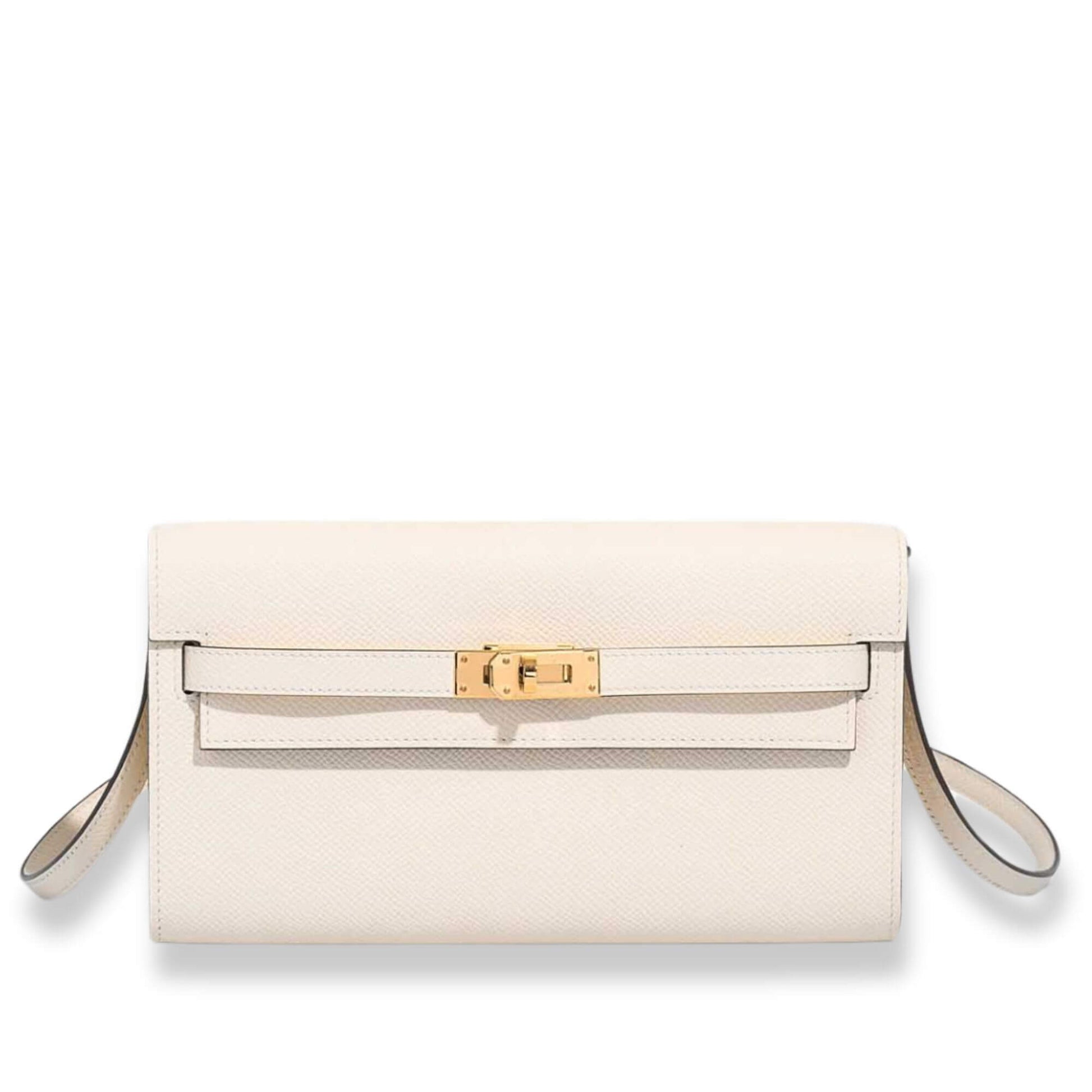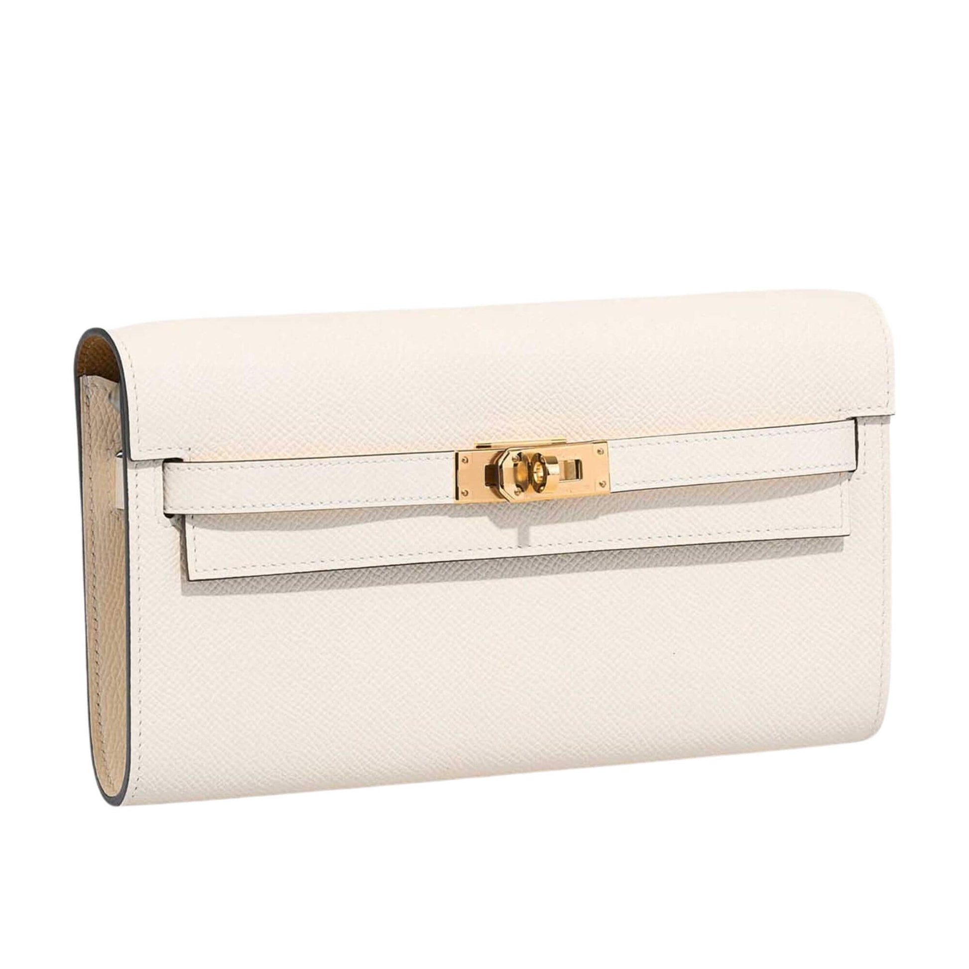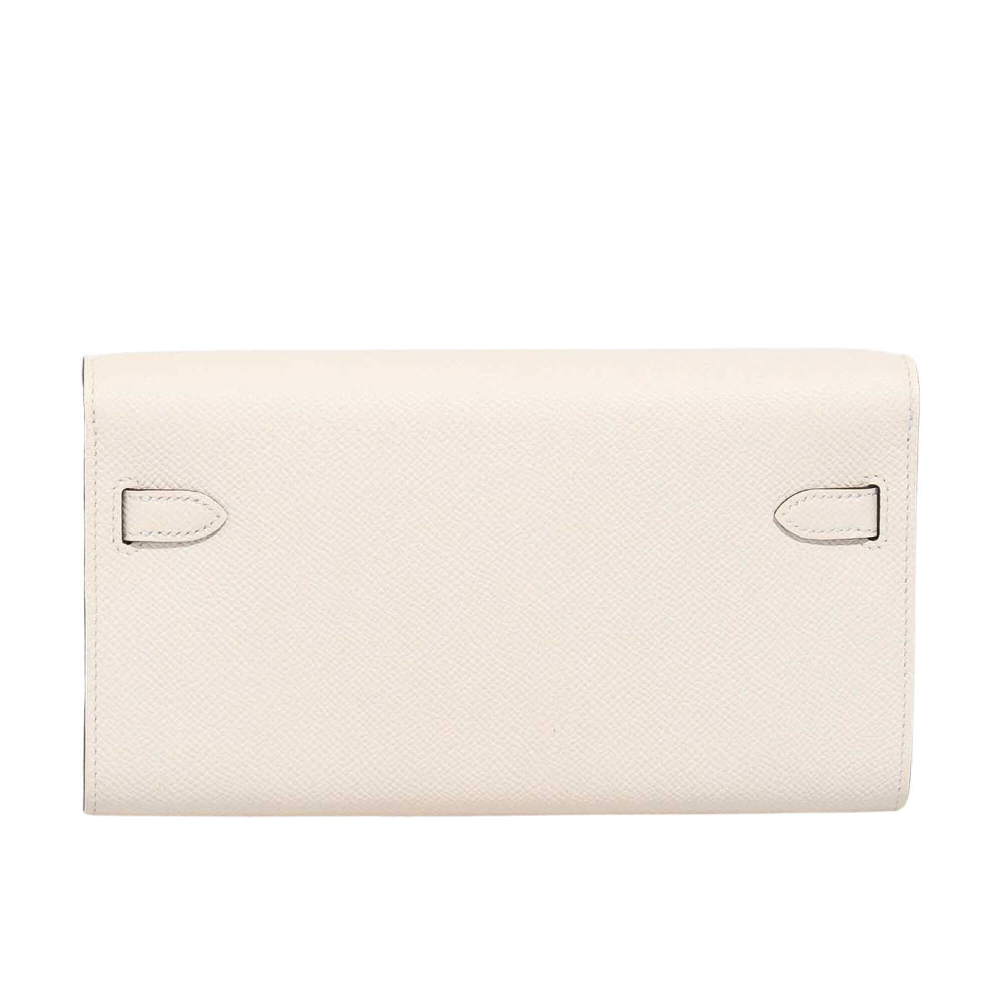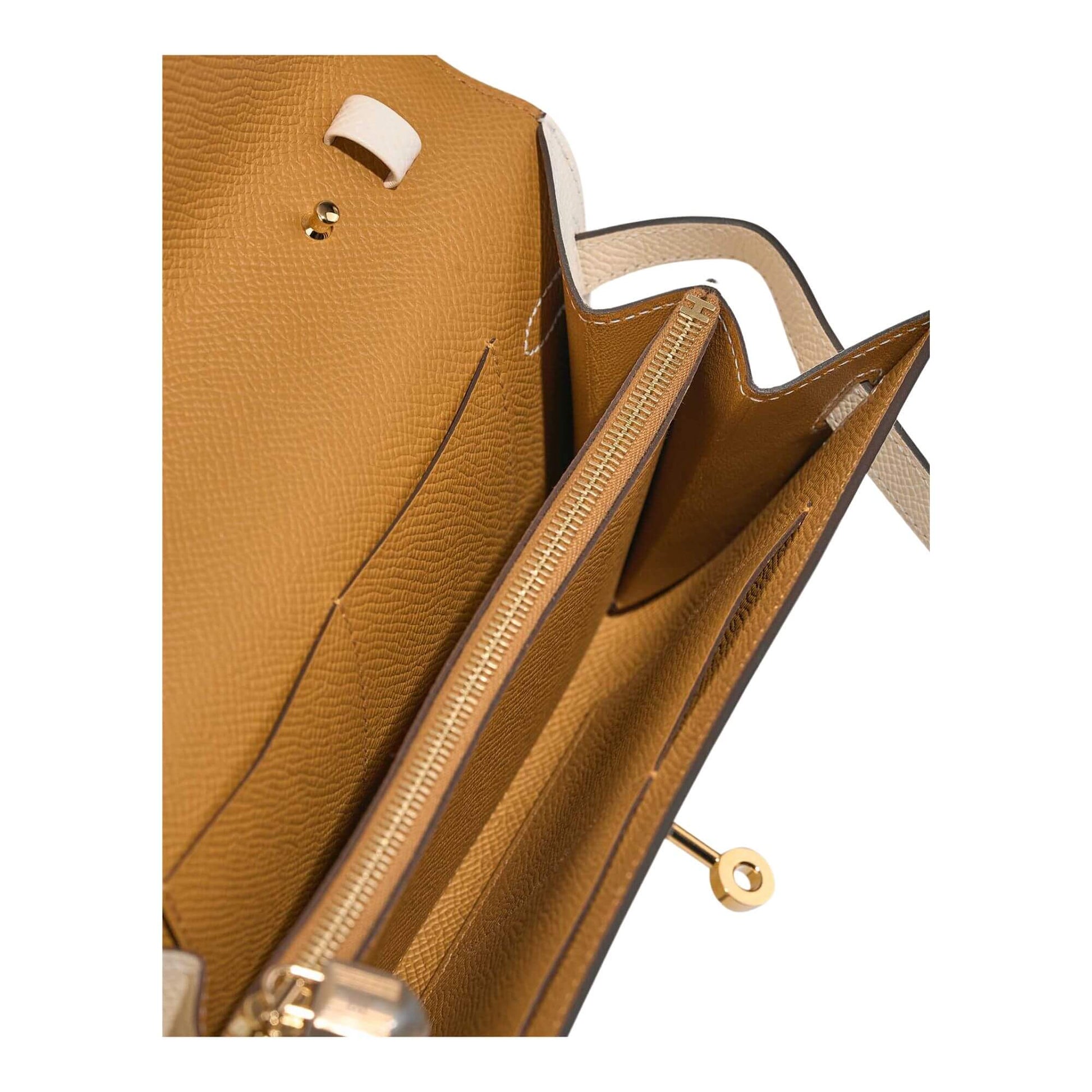 The interior, made with Epsom Leather in Sésame, has two main compartments with four credit card slots and a zippered central compartment with Hermes H lock pull.