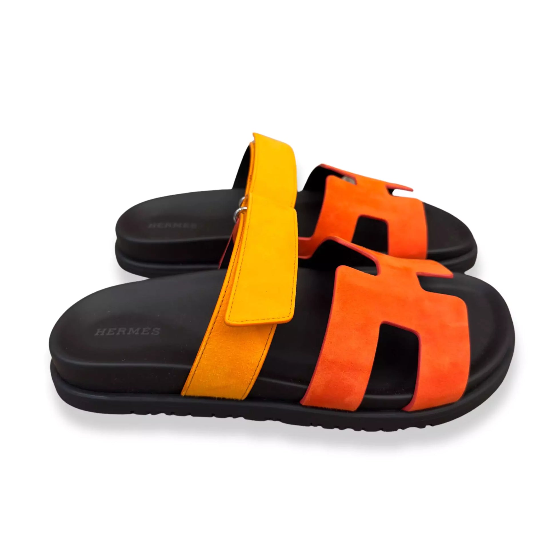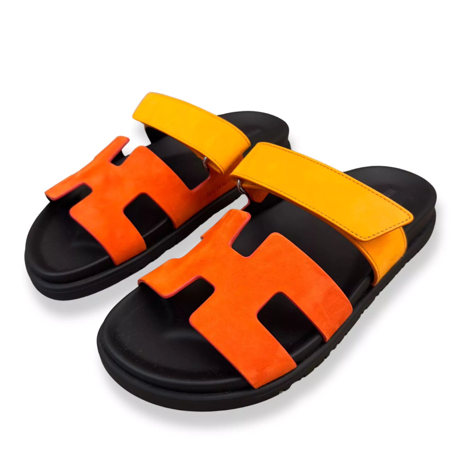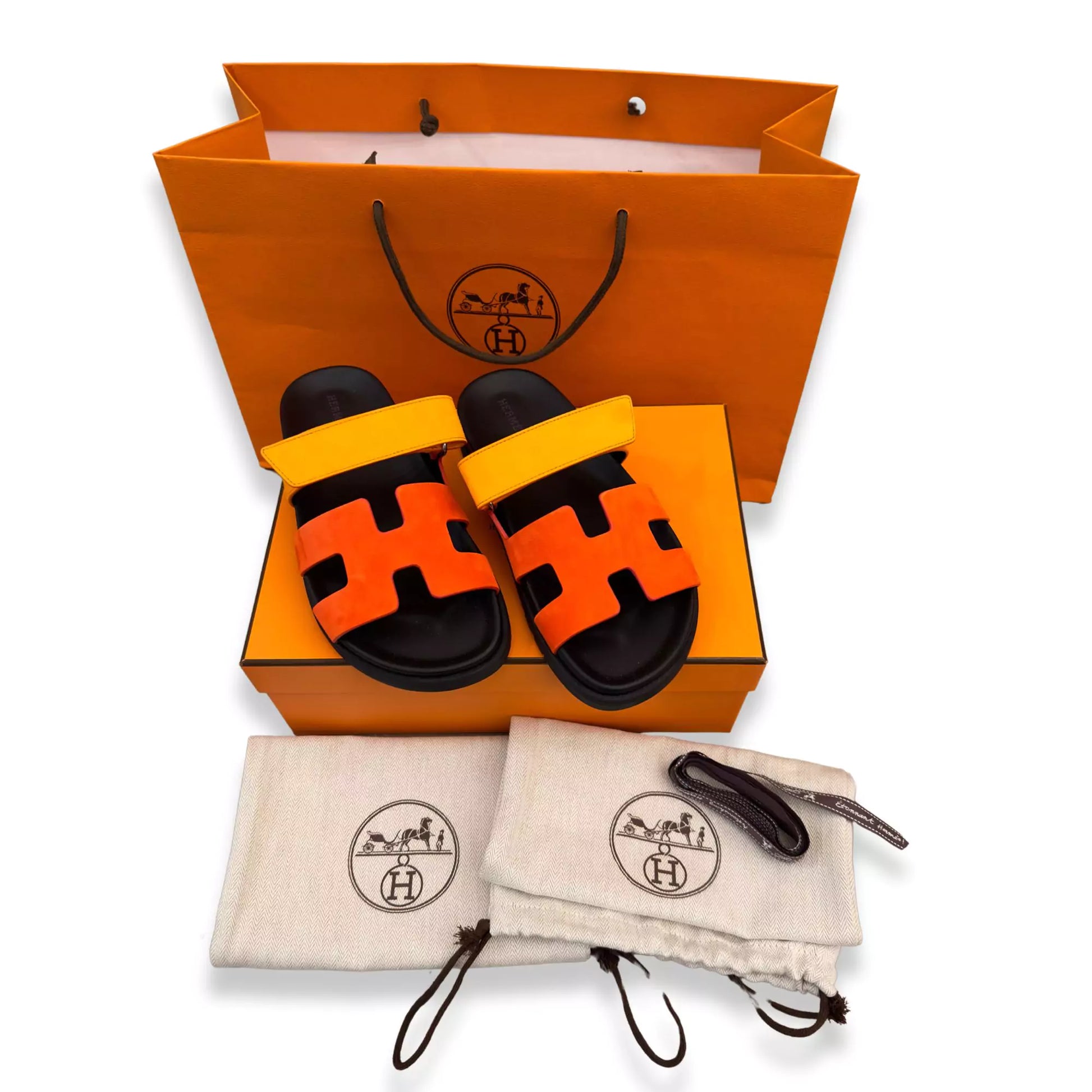 HERMÈS ROUGE ÉCARLATE/SUNSET SUEDE LEATHER CHYPRE SANDALS