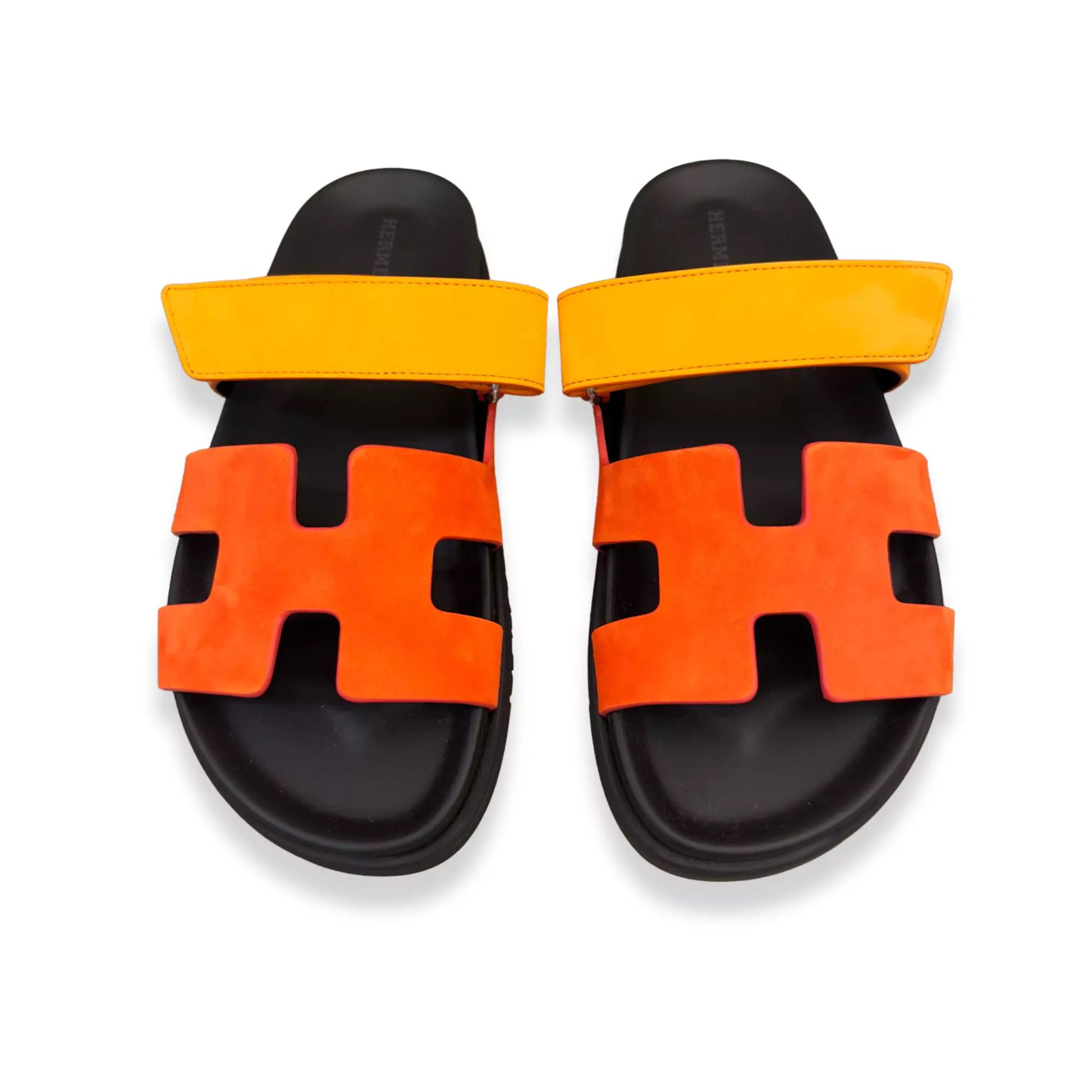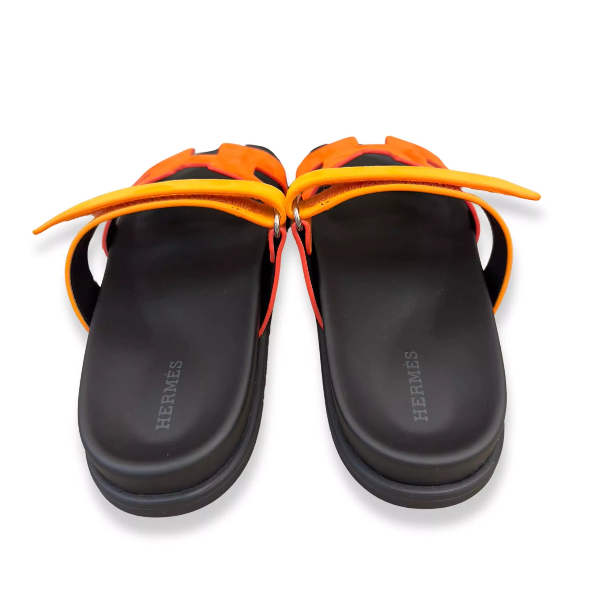 New Hermès Rouge Écarlate / Sunset Suede Leather Chypre Sandals with iconic "H" cut-out.