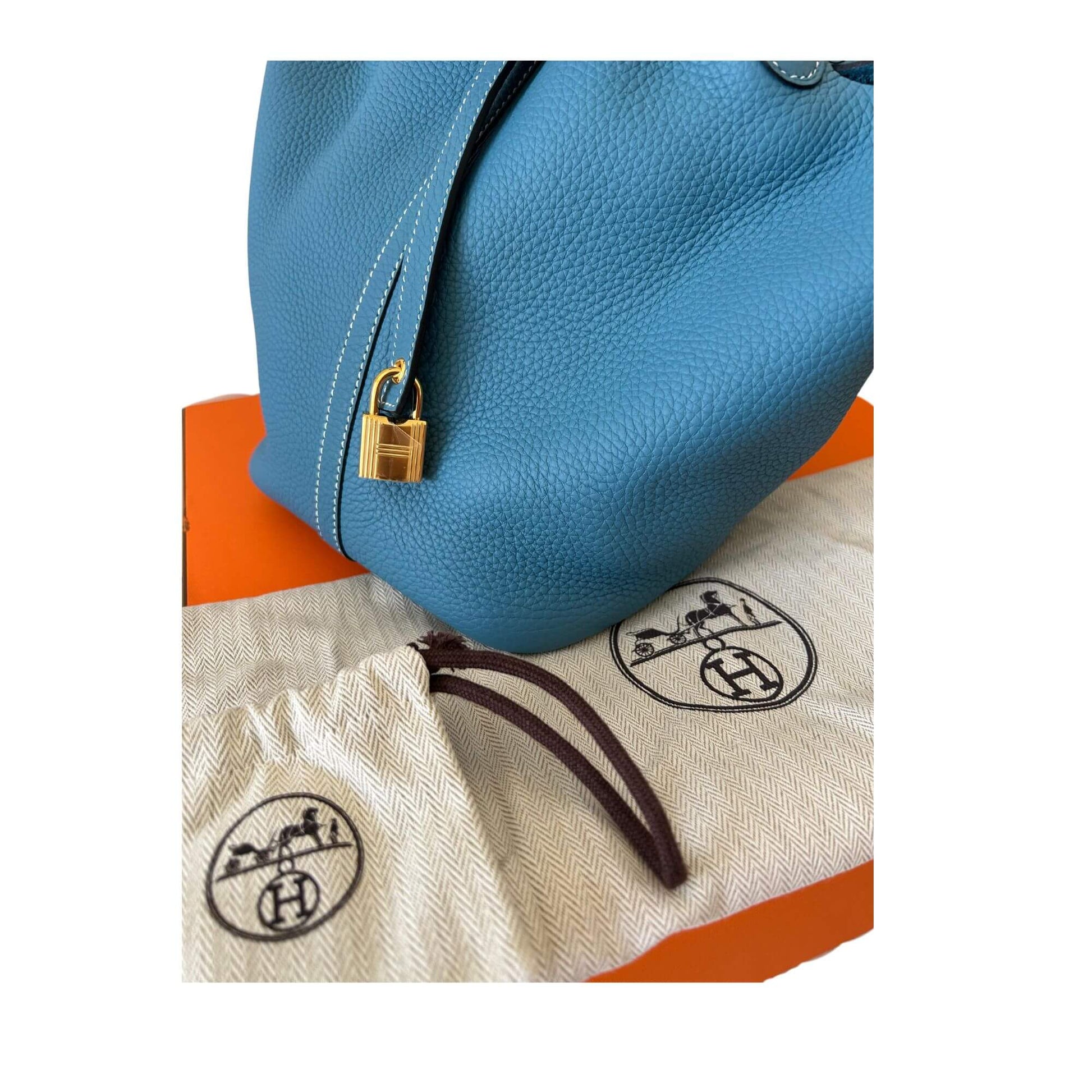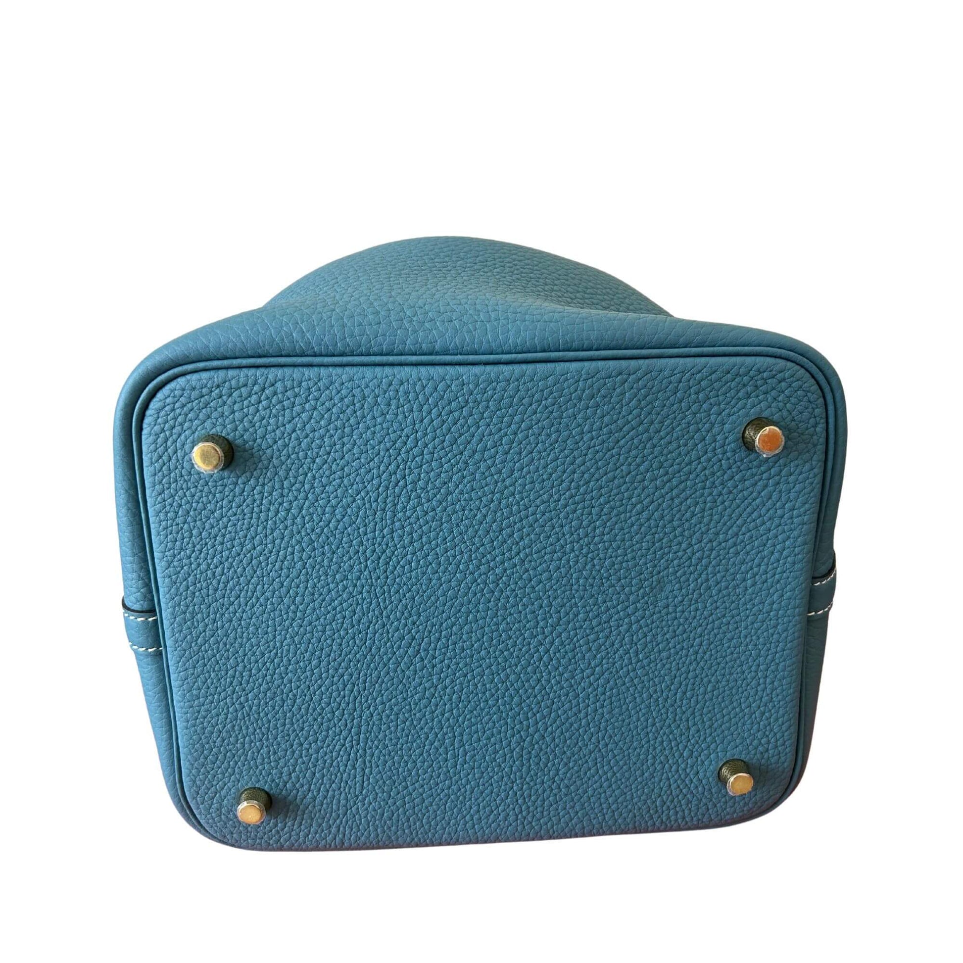 Hermès Picotine 22 in Bleu Jean leather with golden hardware. The interior is lined with natural leather, it doesn't have interior pockets and it comes with a pull through closure secured by padlock.