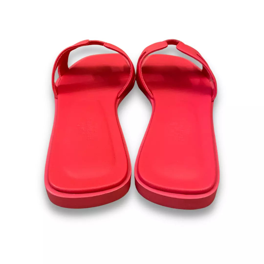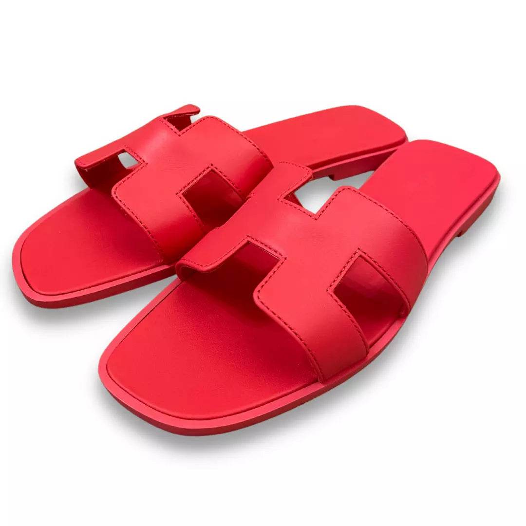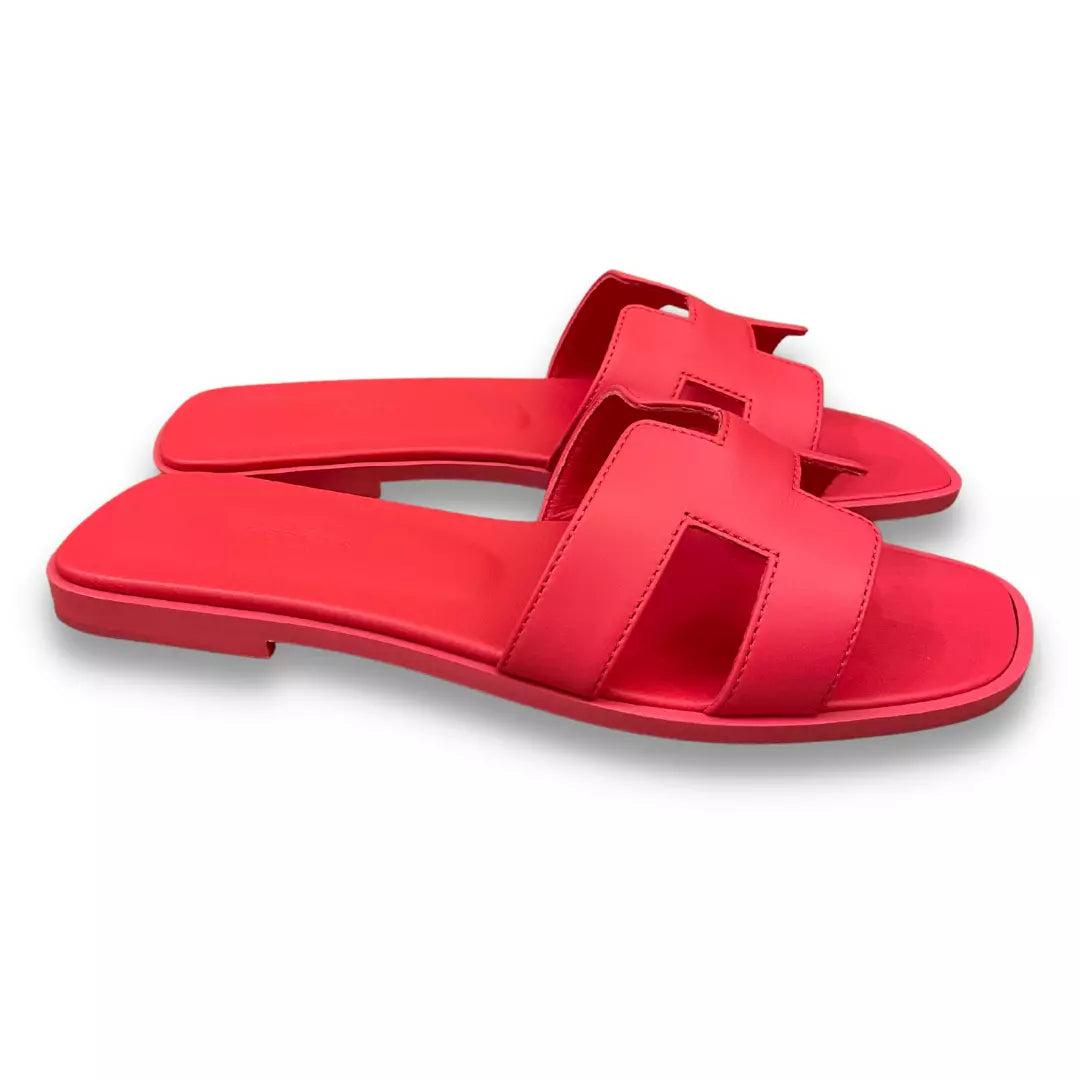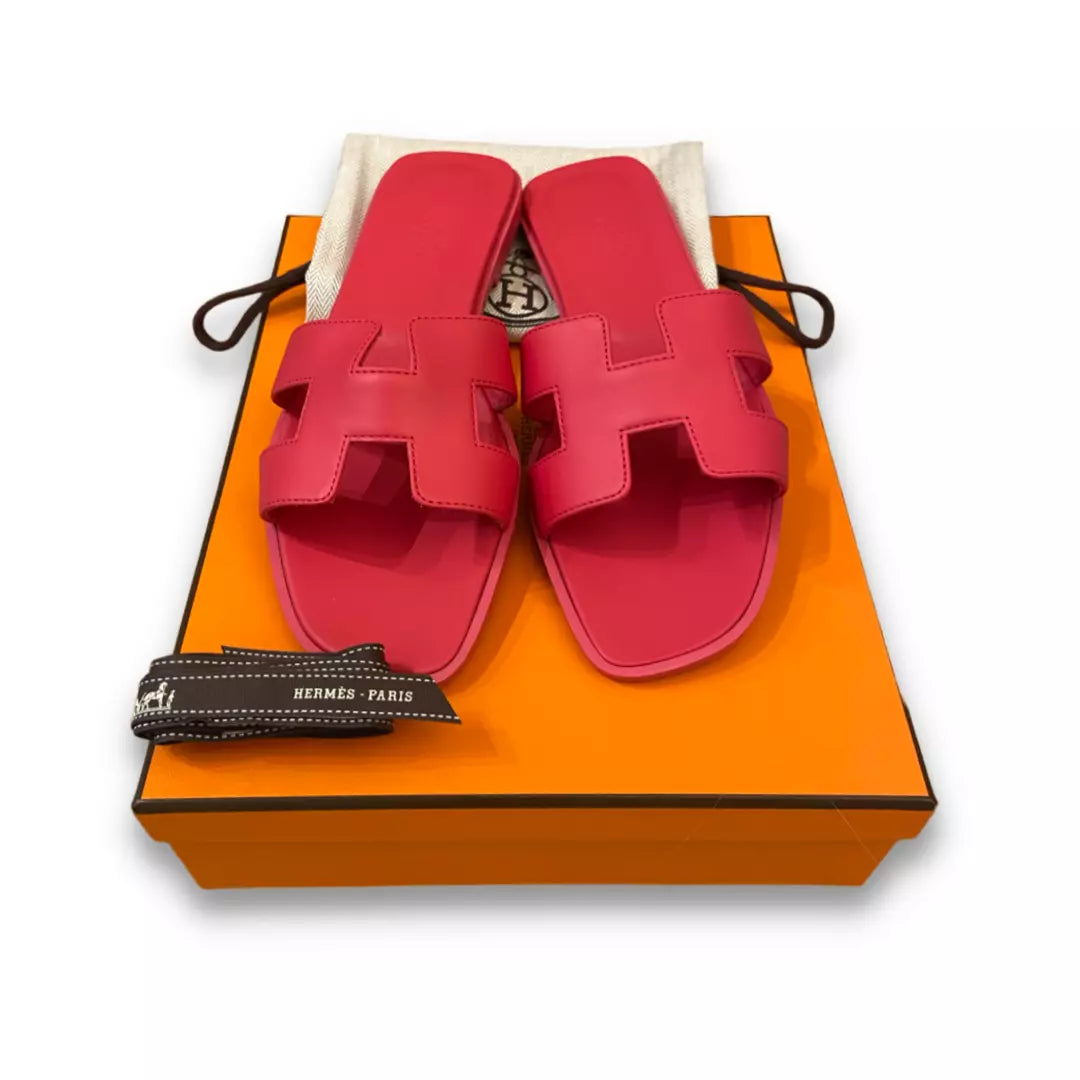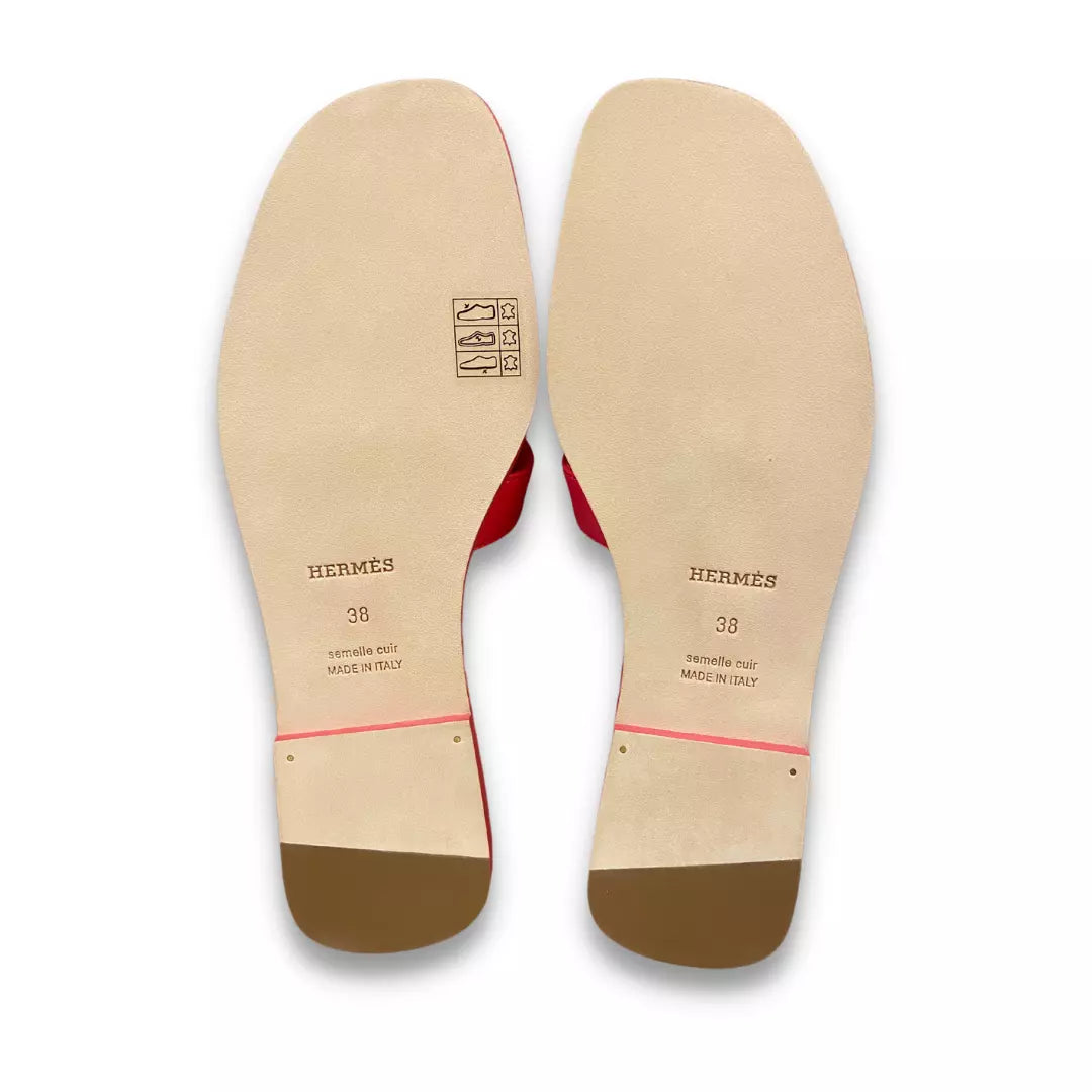 New Hermès Pink Calfskin Leather Oran Sandals with iconic "H" cut-out and nude leather sole.