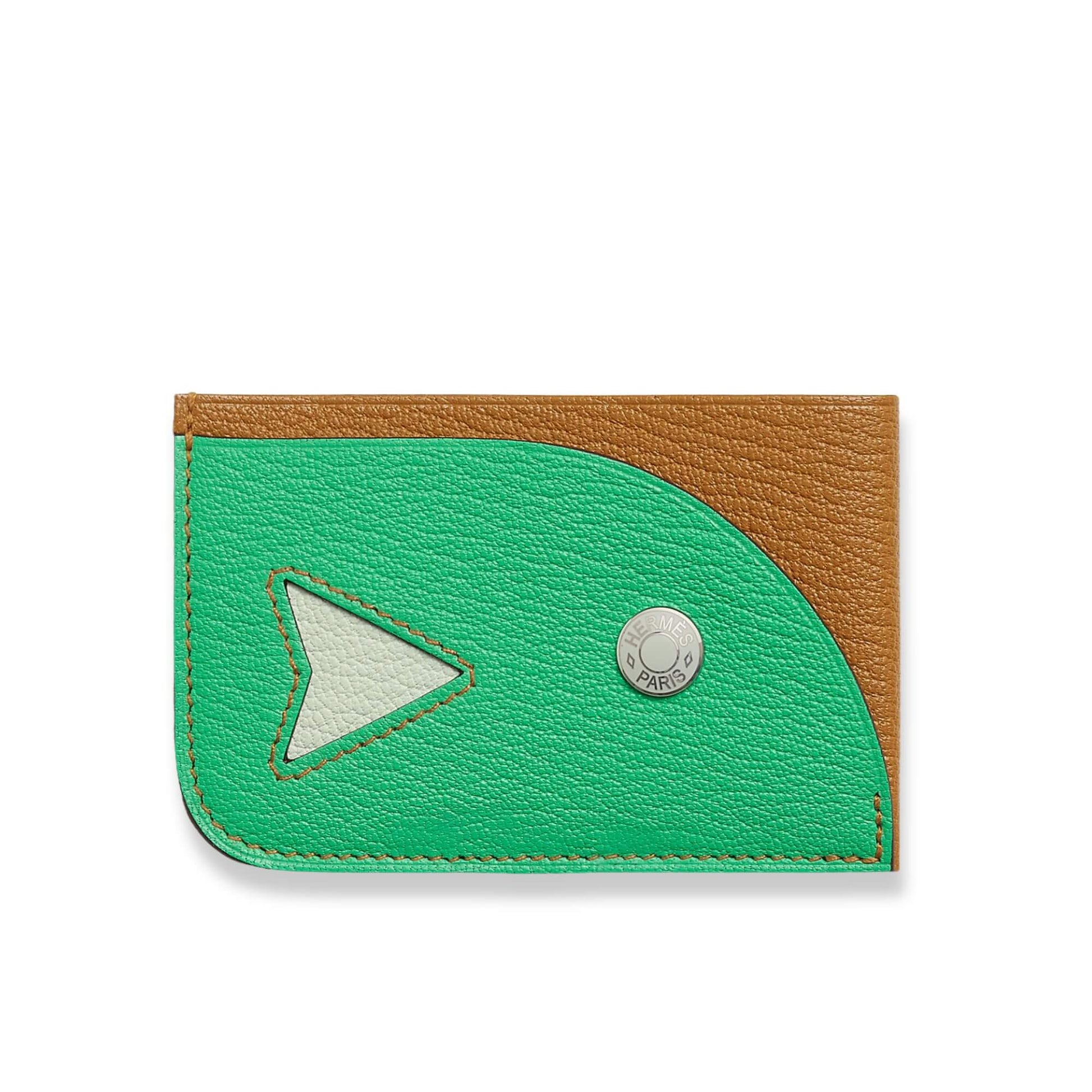 This NEW Hermès Wallet is made out of Mysore sheep leather in Caramel, Vert Comics, Vert Frizz tones. It represent a fish and the details are made out of Palladium Hardware.