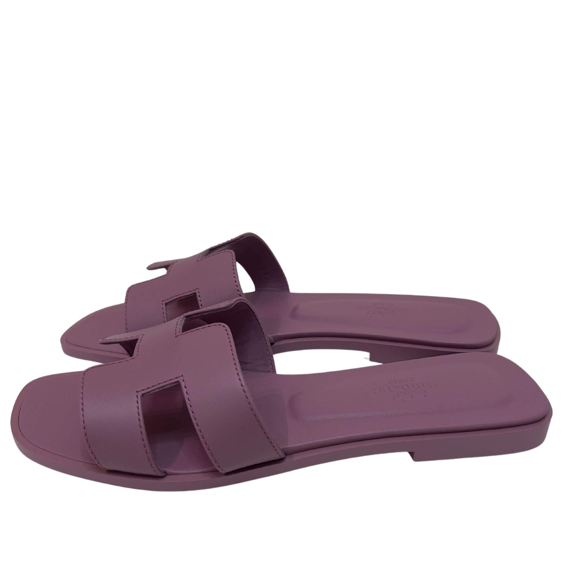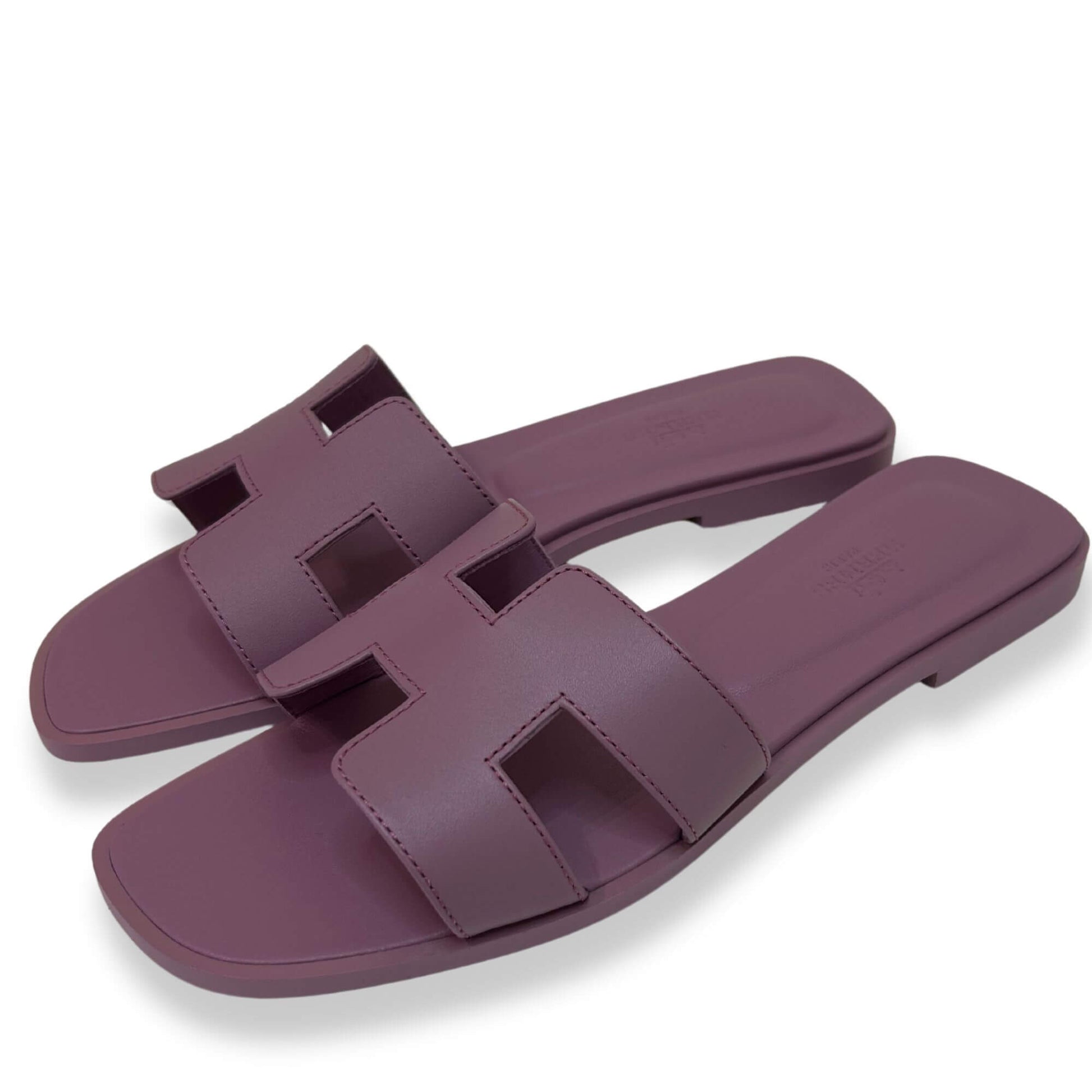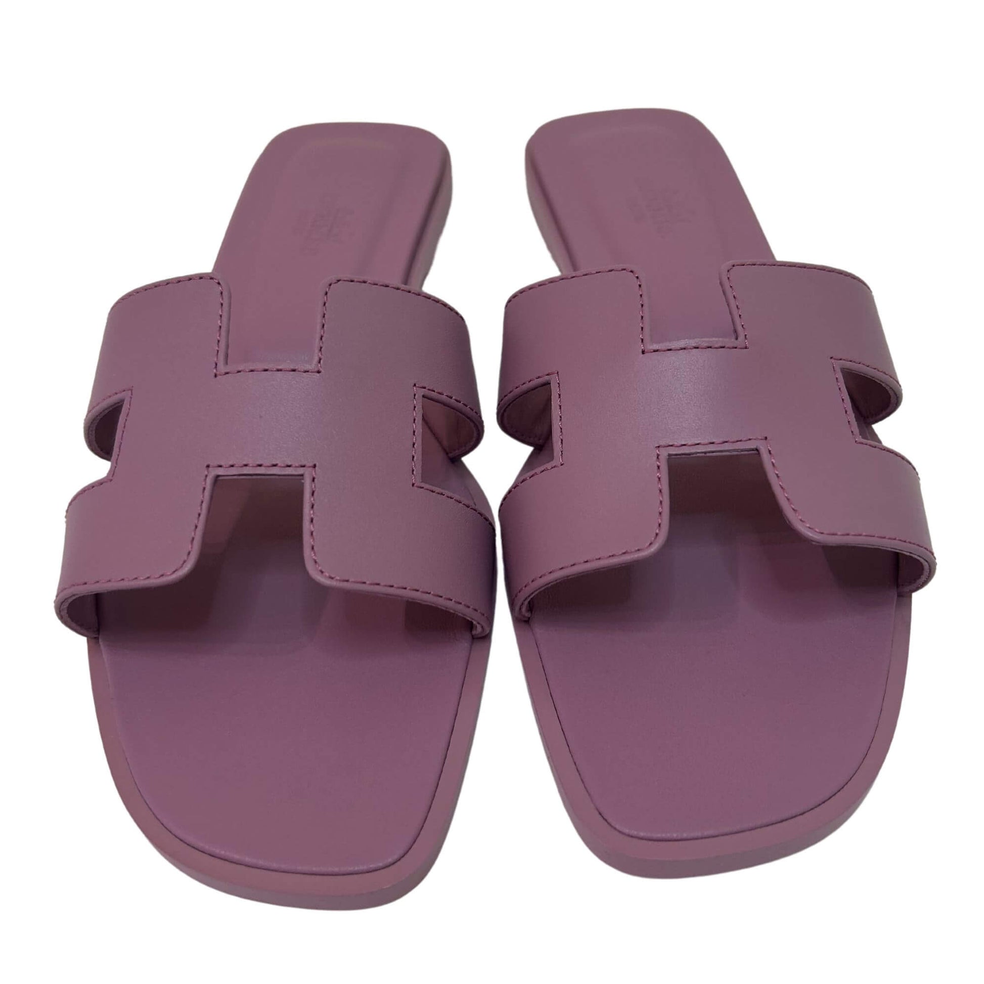These NEW Hermès Oran Sandals are made out of Purple Calfskin Leather with iconic "H" cut-out.