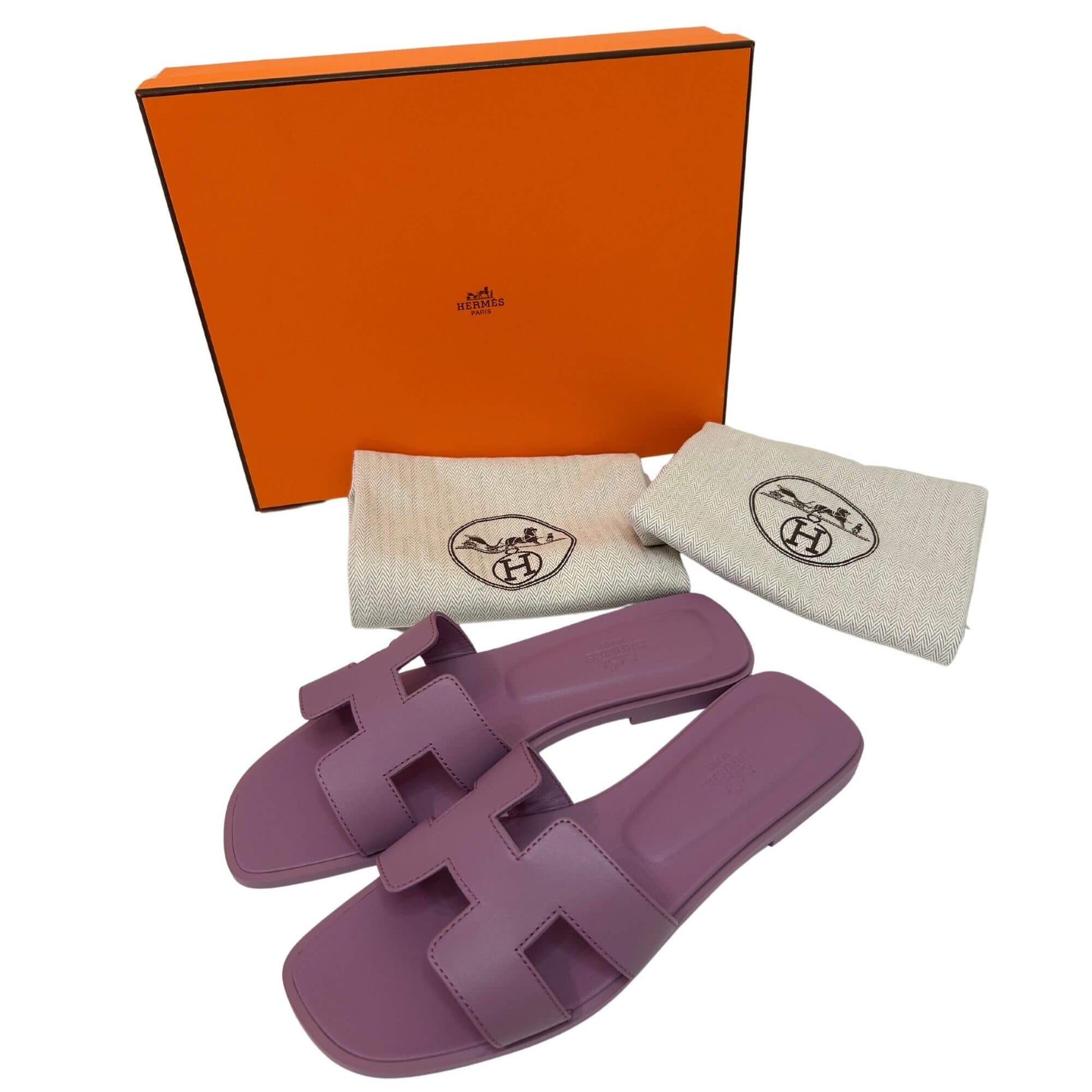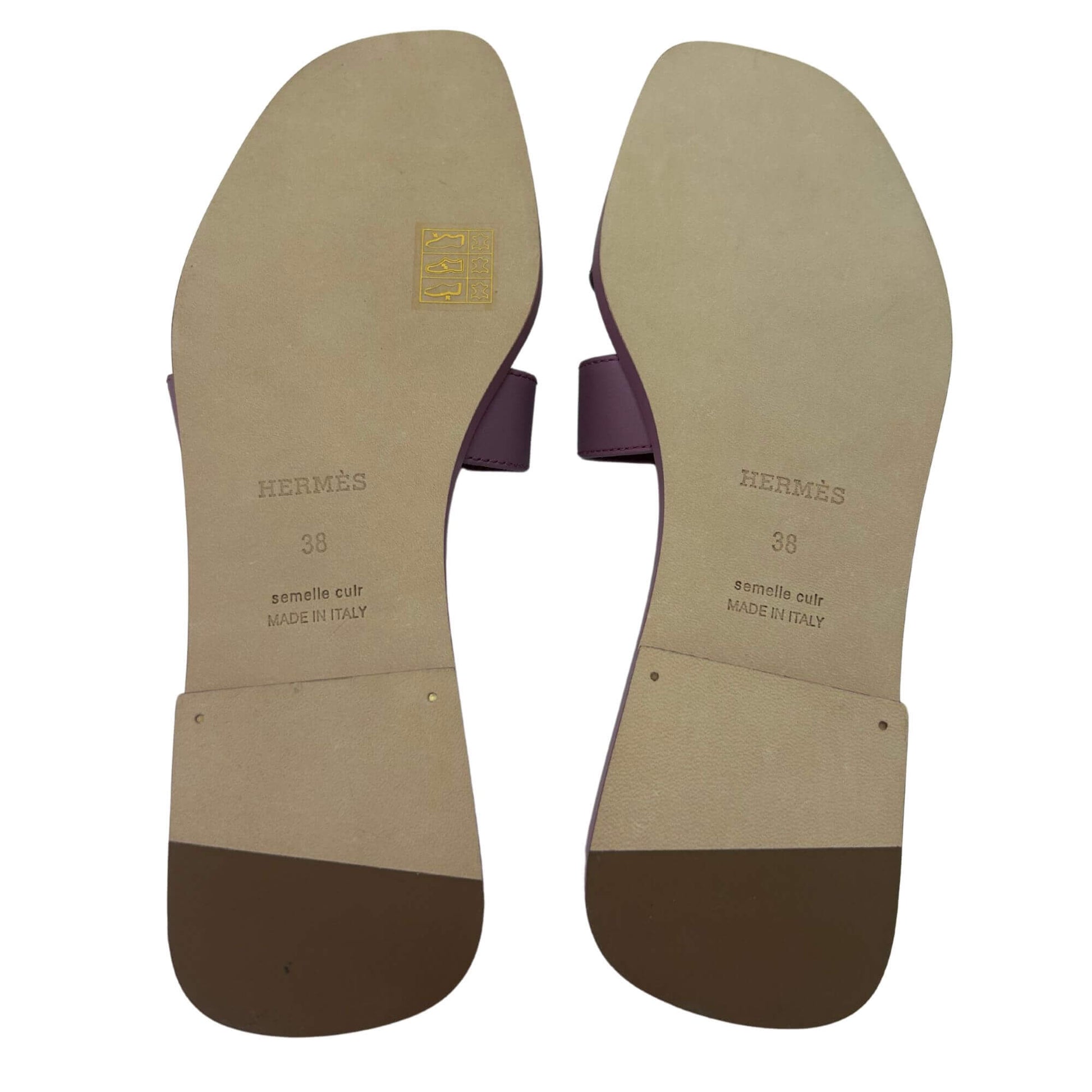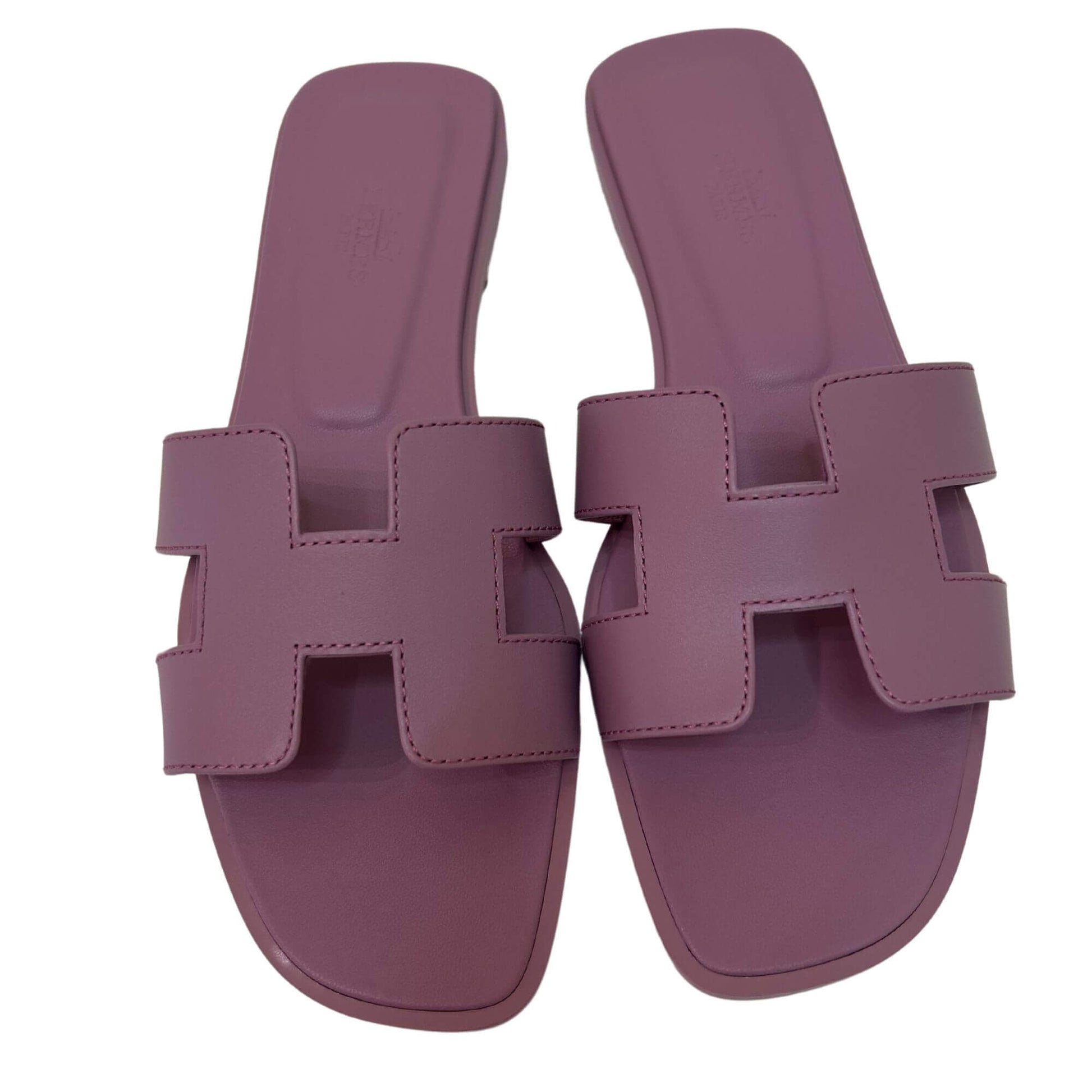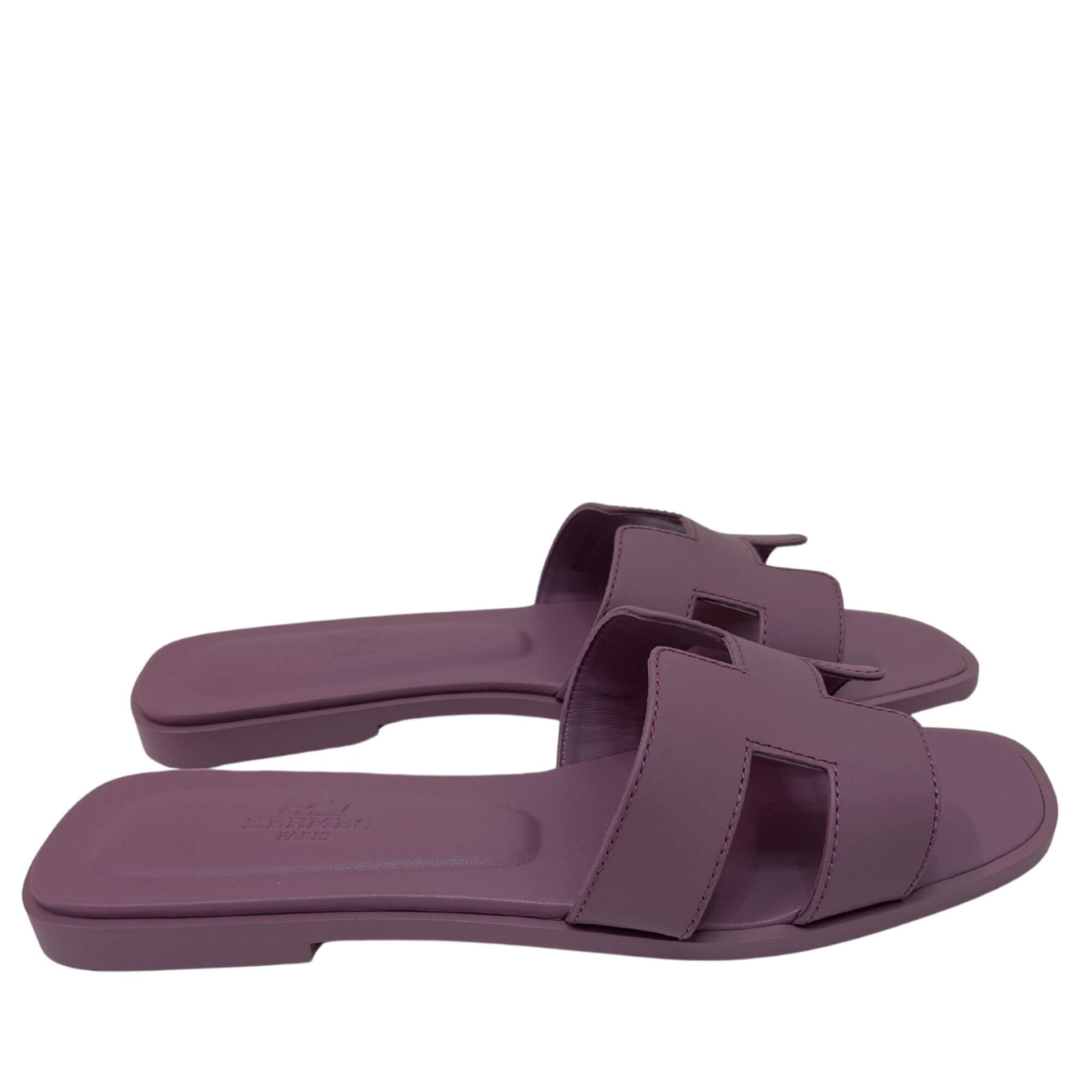 These NEW Hermès Oran Sandals are made out of Purple Calfskin Leather with iconic "H" cut-out.