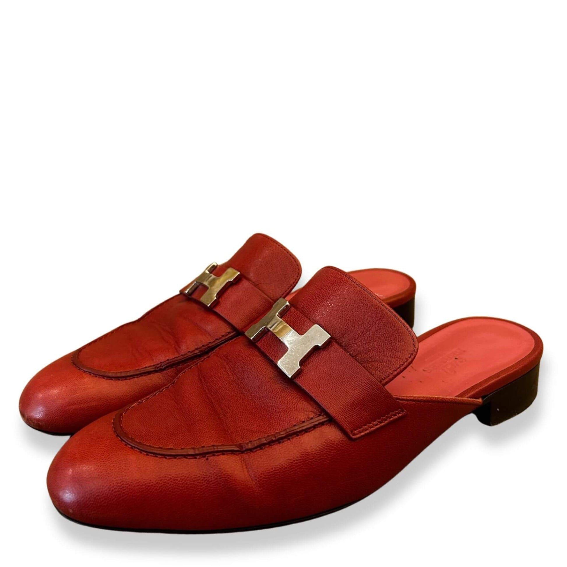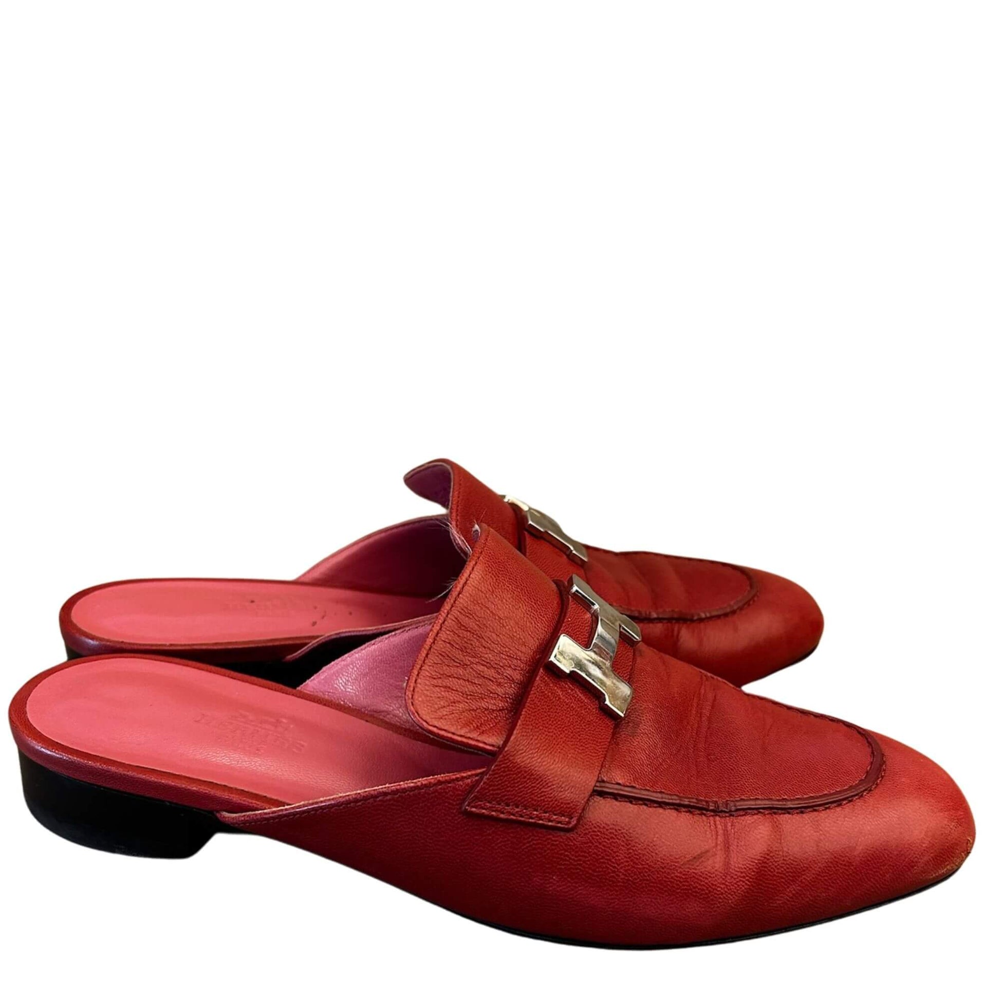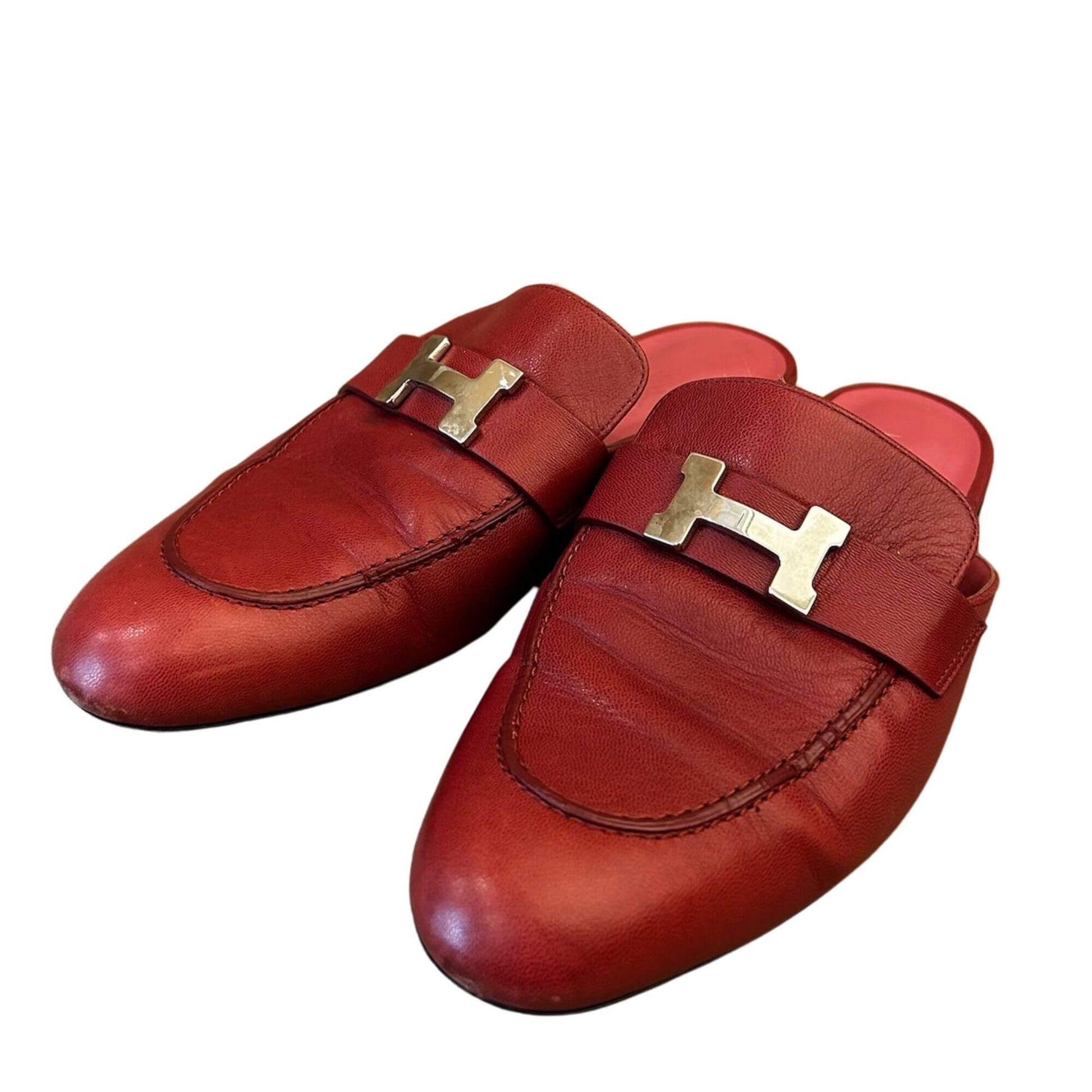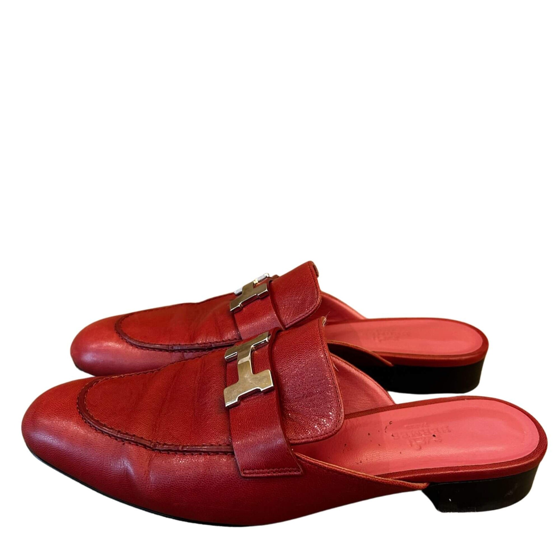 These PRE-LOVED Hermès loafers are made out of red leather. In the front, they have the iconic ''H'' of the brand in palladium hardware.
