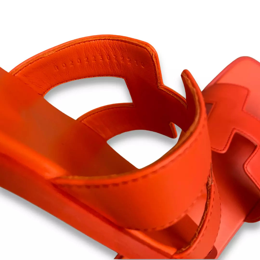 New Hermès Rouge Jaipur Calfskin Leather Oran Sandals with iconic "H" cut-out and nude leather sole.
