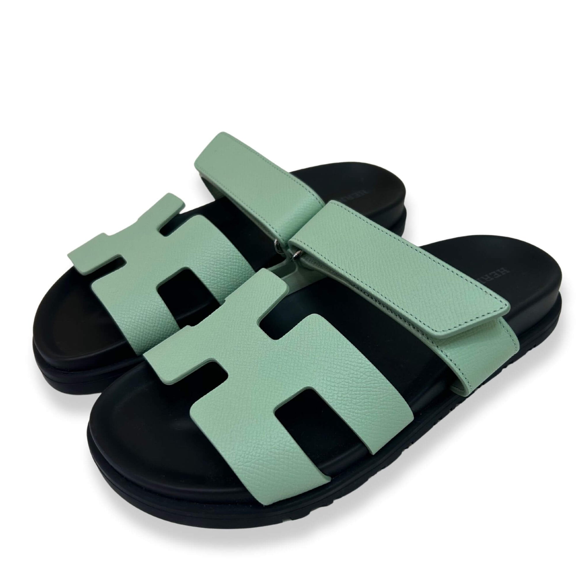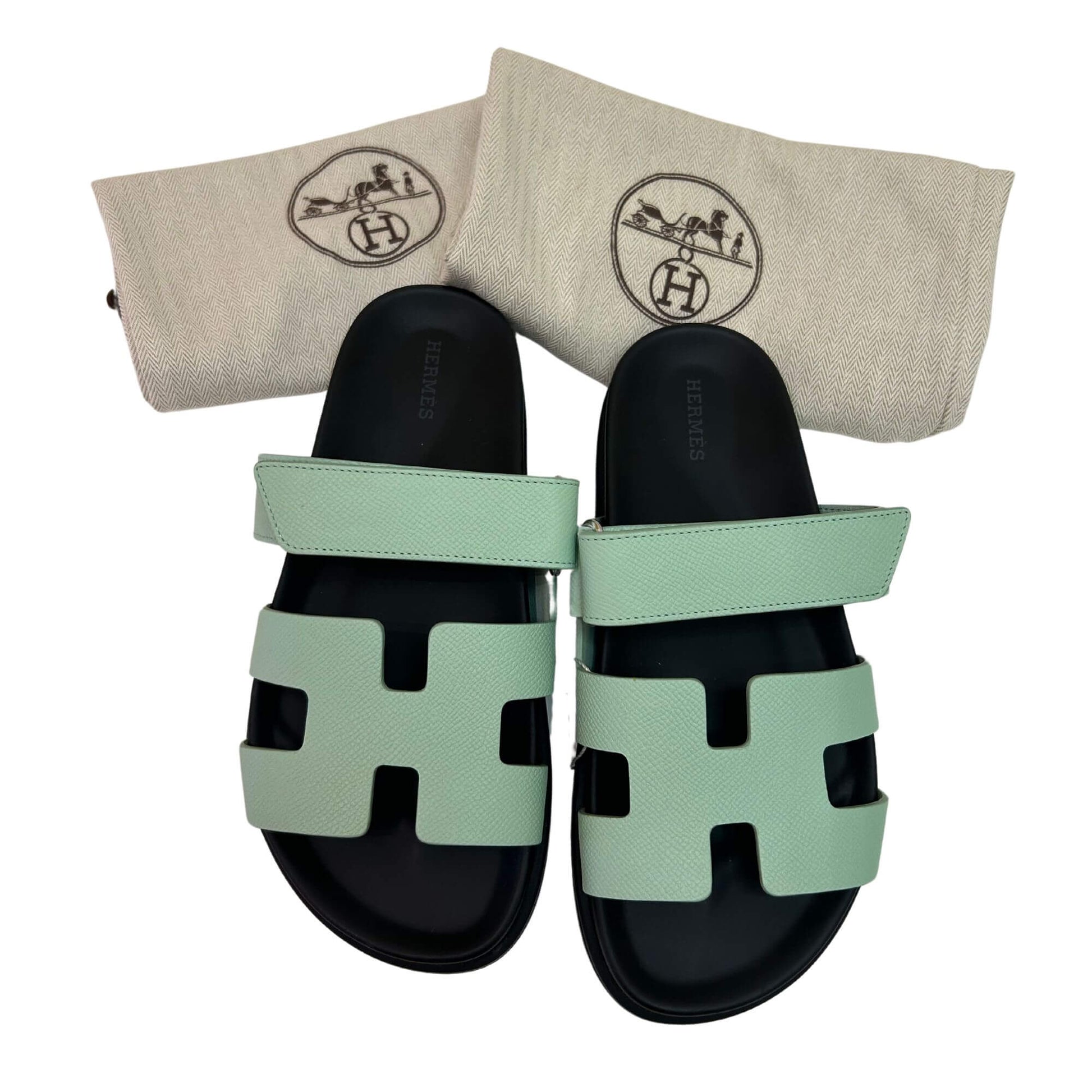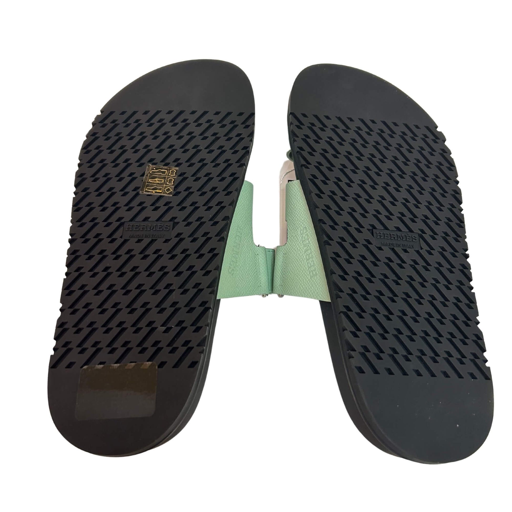 This NEW Hermès Sandals are made out of calf suede leather in vert jade. The sole of the shoe is made of rubber and the strap is adjustable, perfect to adapt to anyone.