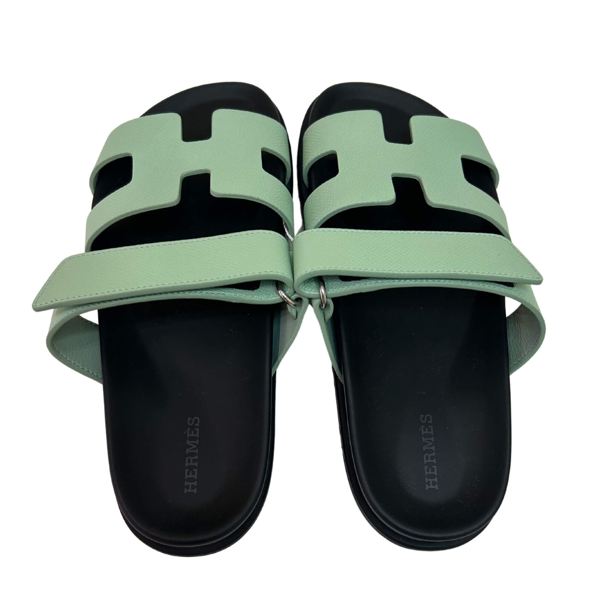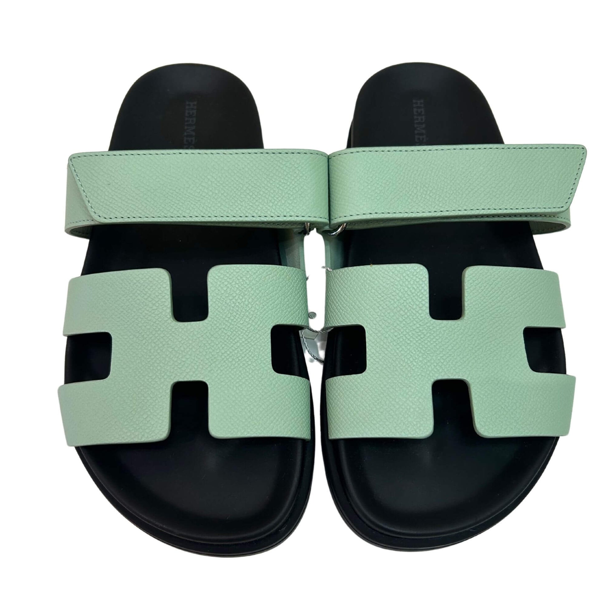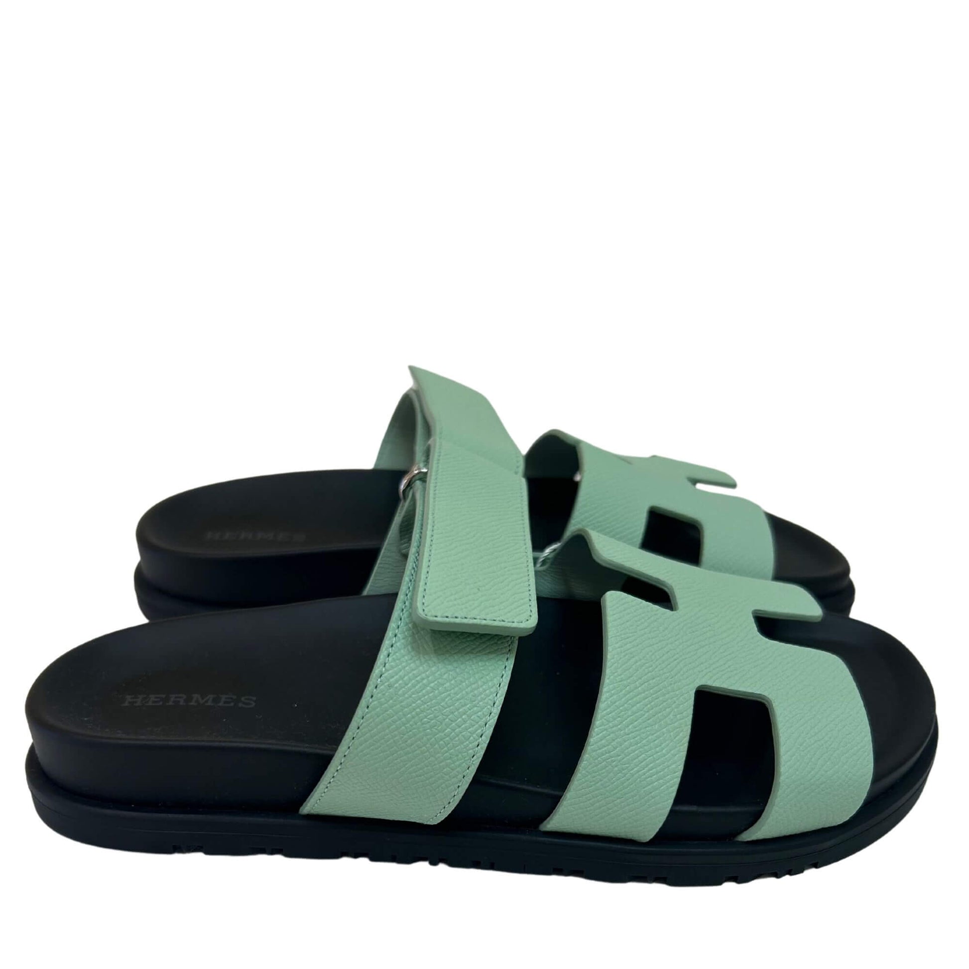 This NEW Hermès Sandals are made out of calf suede leather in vert jade. The sole of the shoe is made of rubber and the strap is adjustable, perfect to adapt to anyone.