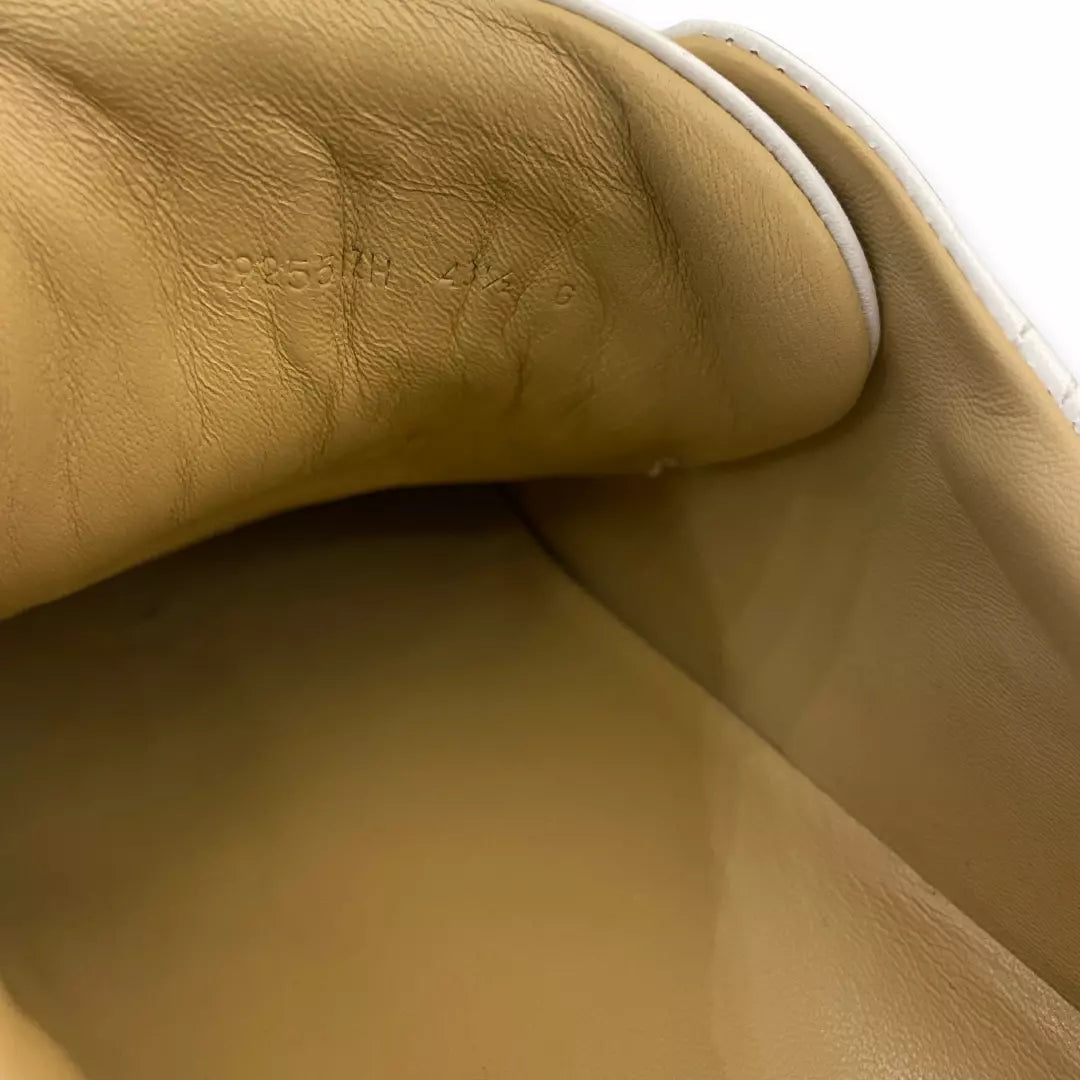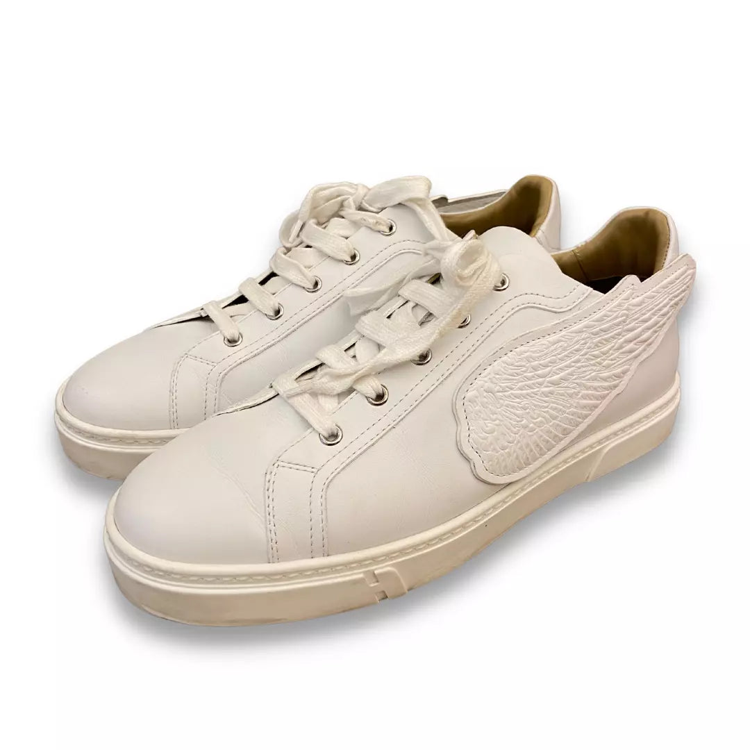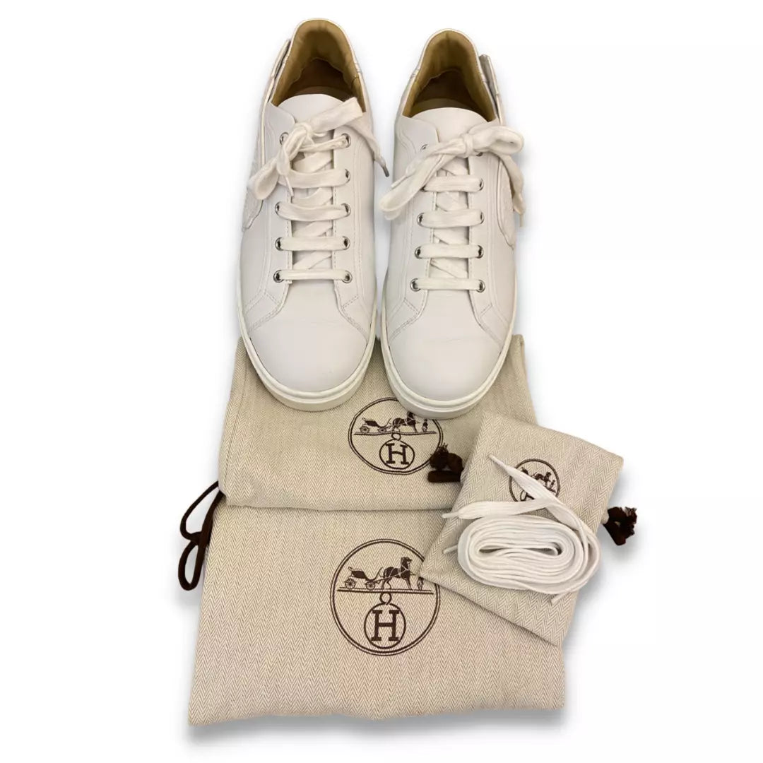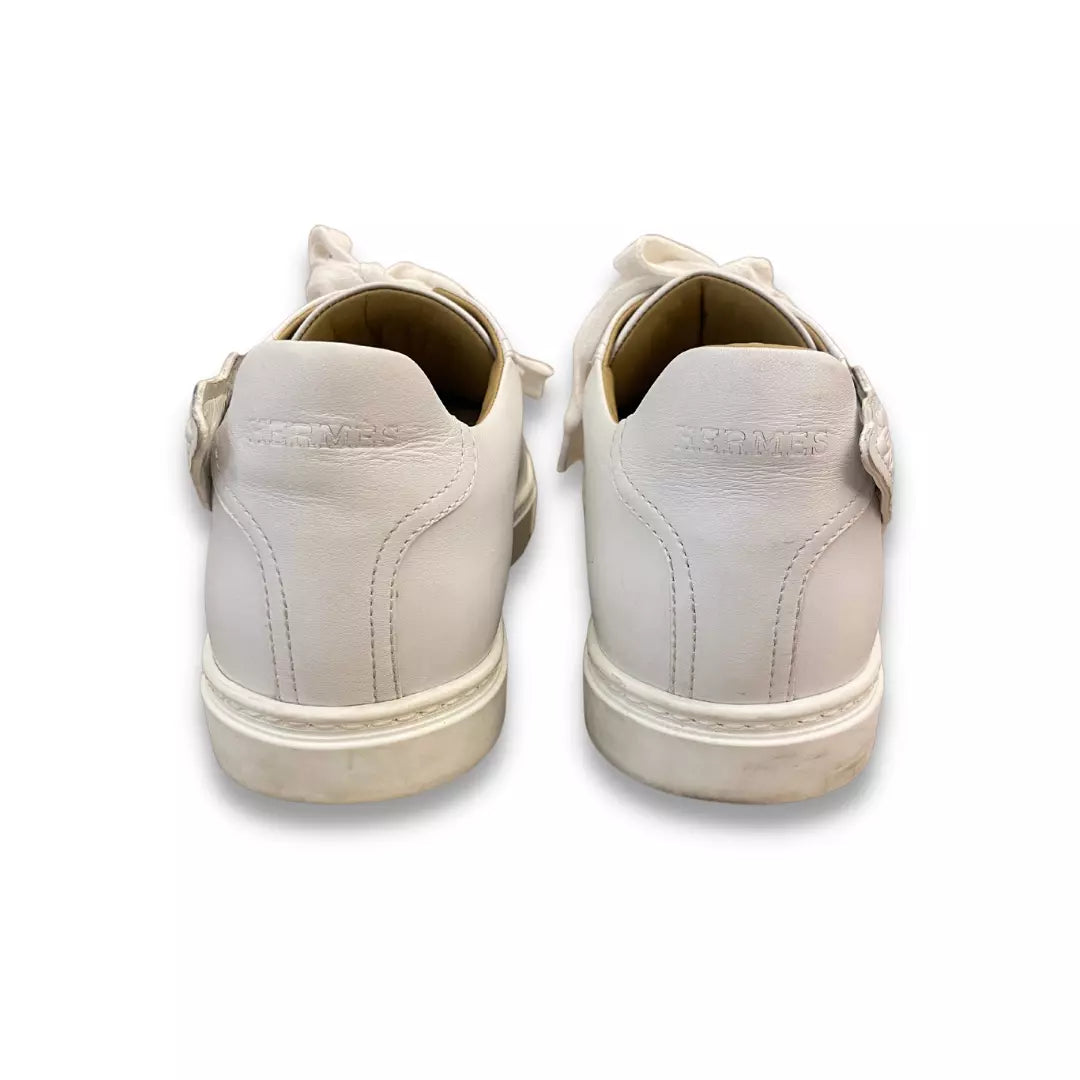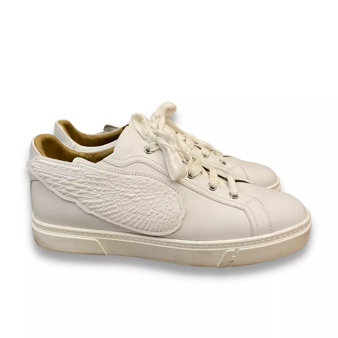 These Pre-Loved Hermès White Calfskin Wing Sneakers, are crafted of soft white leather with a wing on the side, grey leather trim, and an Hermes signature on the heel cap. These are in Very Good Condition.