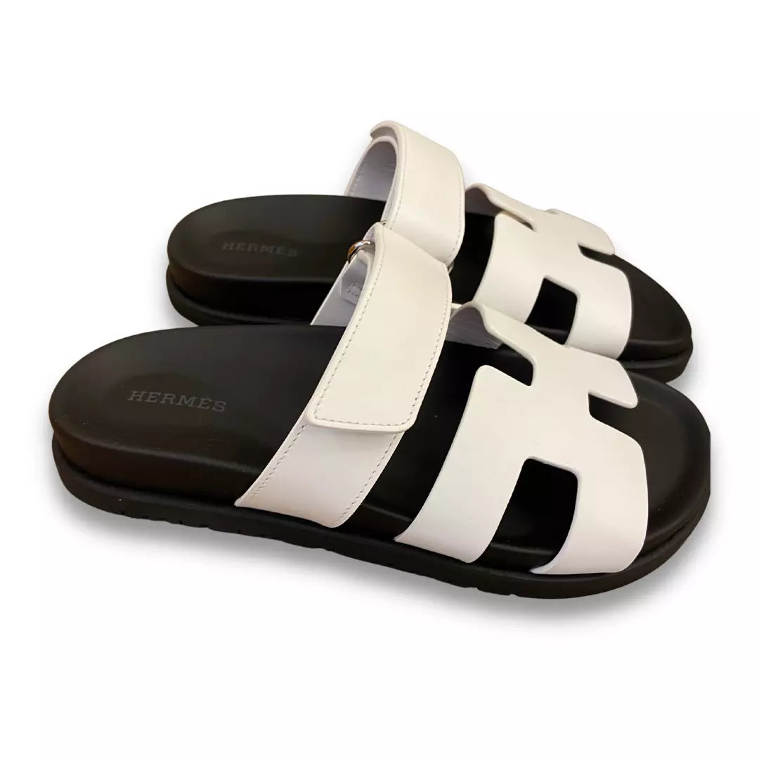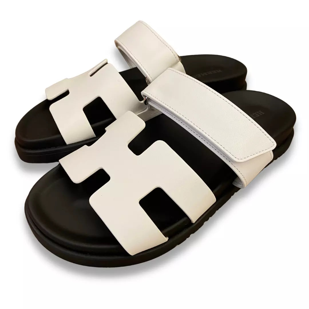 New Hermès White Calfskin Leather Chypre Sandals with iconic "H" cut-out.