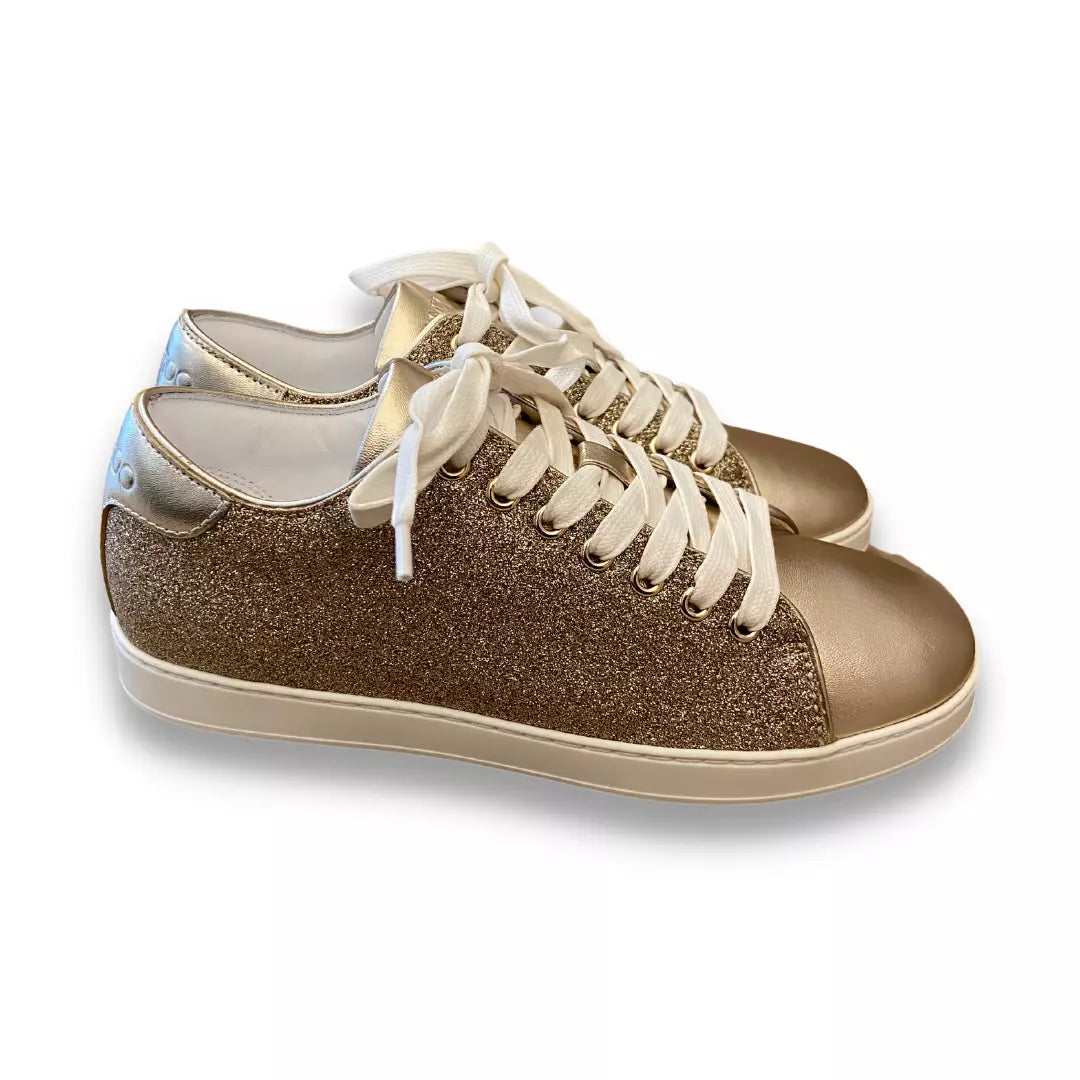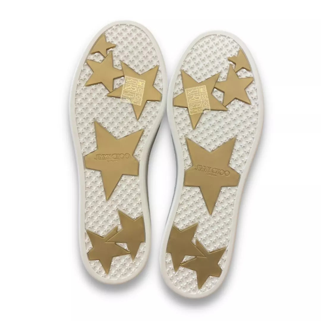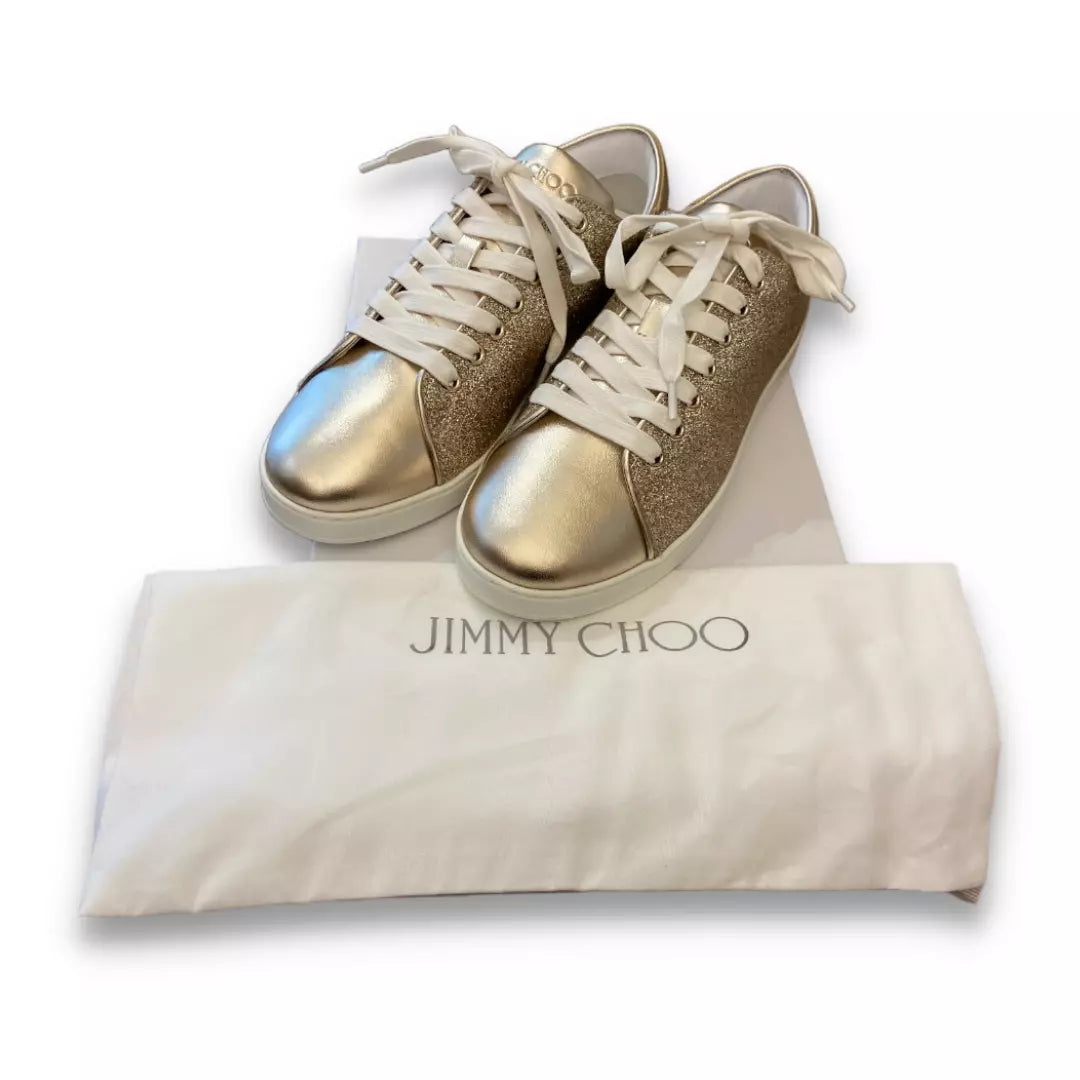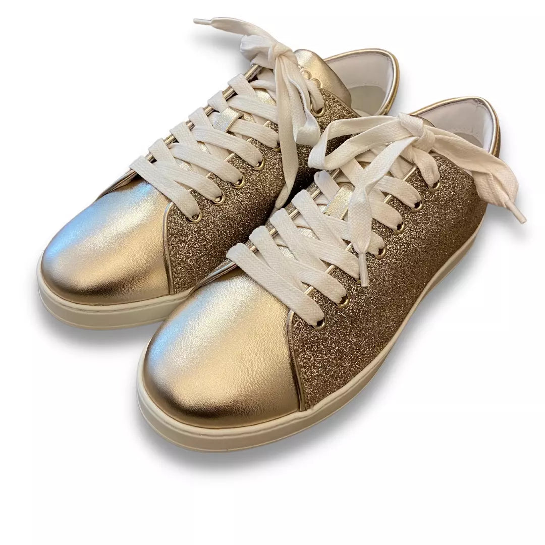 New Jimmy Choo Gold Trainers and glitter details crafted in high-performance calf leather. Featuring lace-up closure, rounded toe, signature star on soles, leather lining and tonal rubber sole.