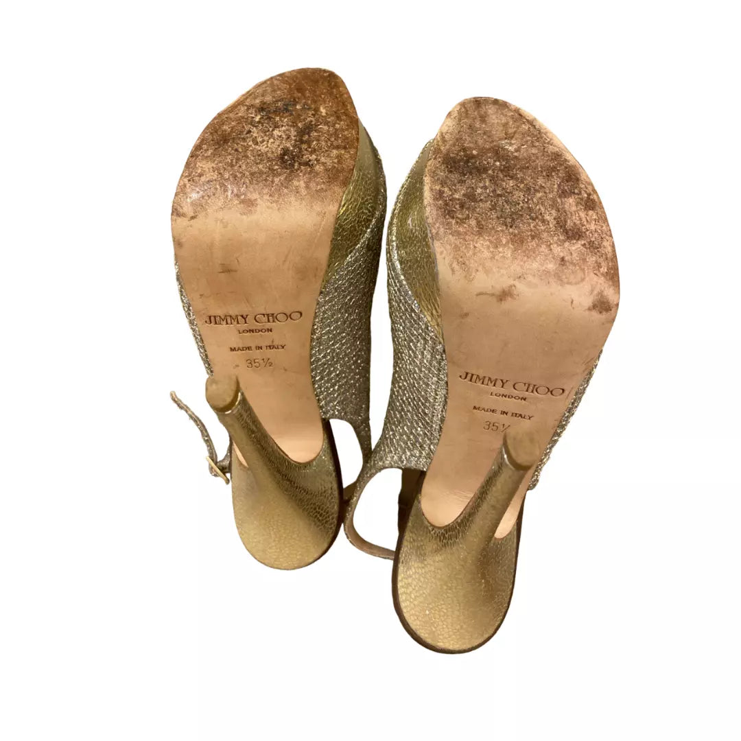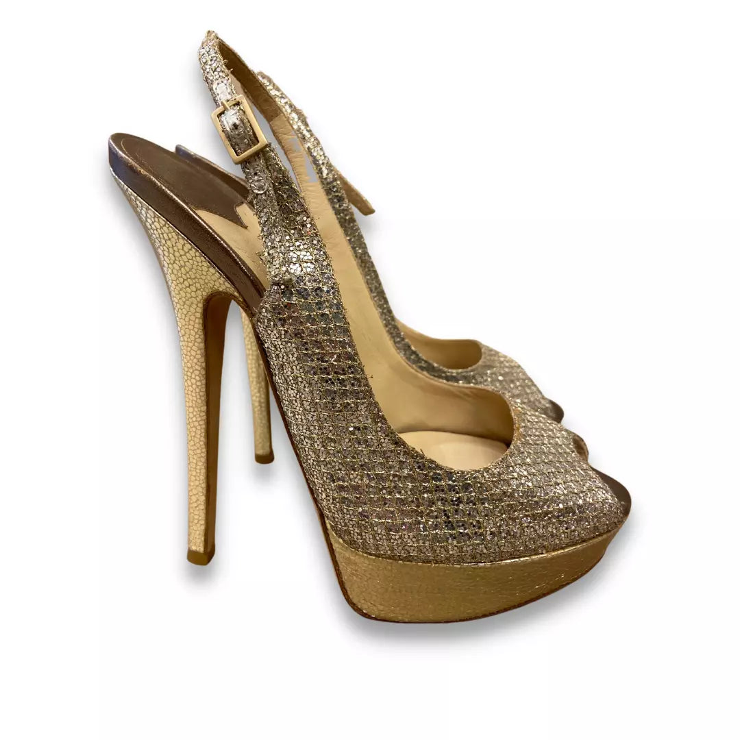 These Pre-Loved Jimmy Choo Silver Glitter Platforms, adorned with delicate silver glitter details and a gold platform, boast 14 cm heels and a 2 cm platform. They are in very condition, making them a glamorous addition to your footwear collection.