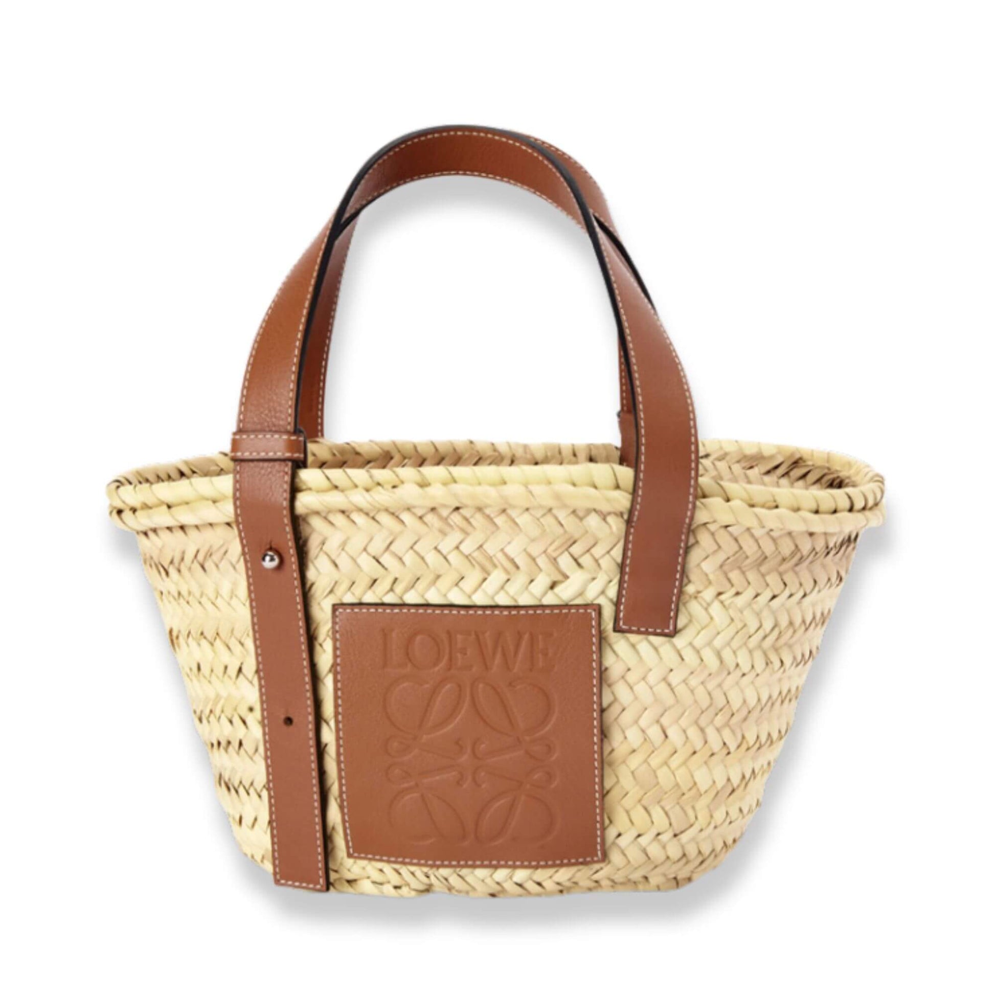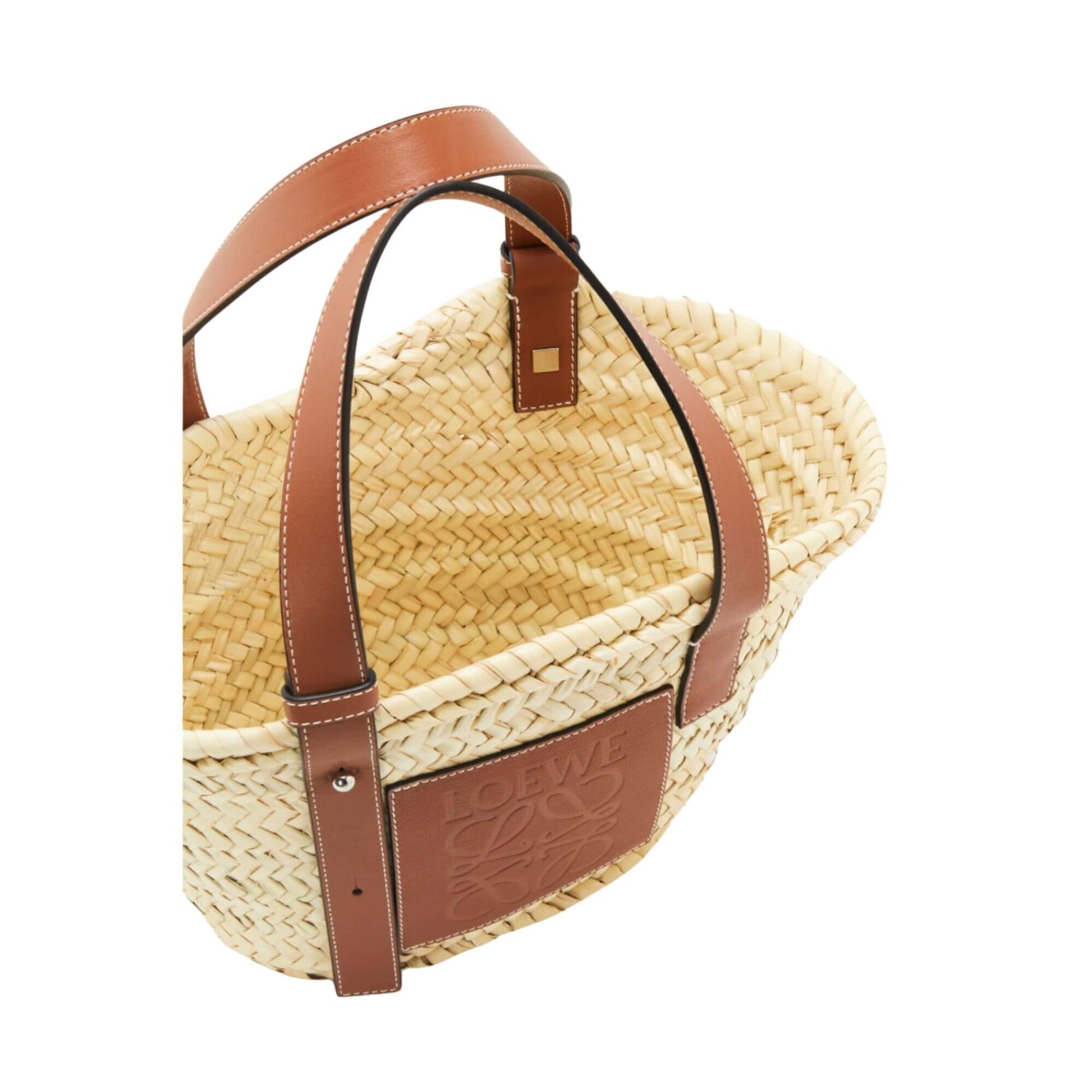 This NEW Loewe bag is made out of a classic hand-woven body and calfskin top handles in Natural/Tan tones. It has an Engraved Anagram Patch, and is customizable with strap and charms. Due to its handmade nature, the size may vary slightly, making each piece unique.