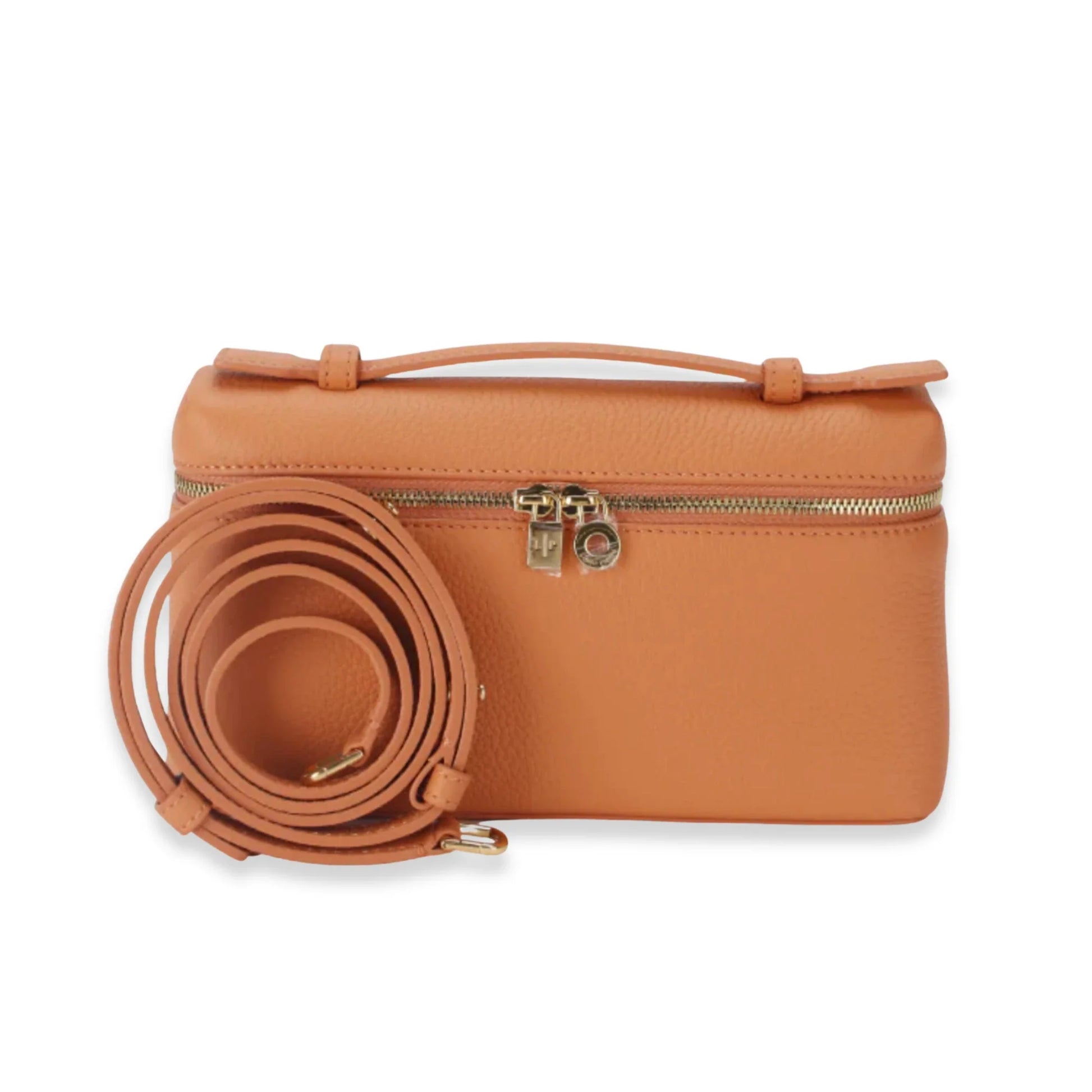 This new L19 Cinnamon Orange Extra Pocket Leather Crossbody has a leather handle and a shoulder strap in cinnamon orange color. It has a double zipper with charms made out of gold hardware.