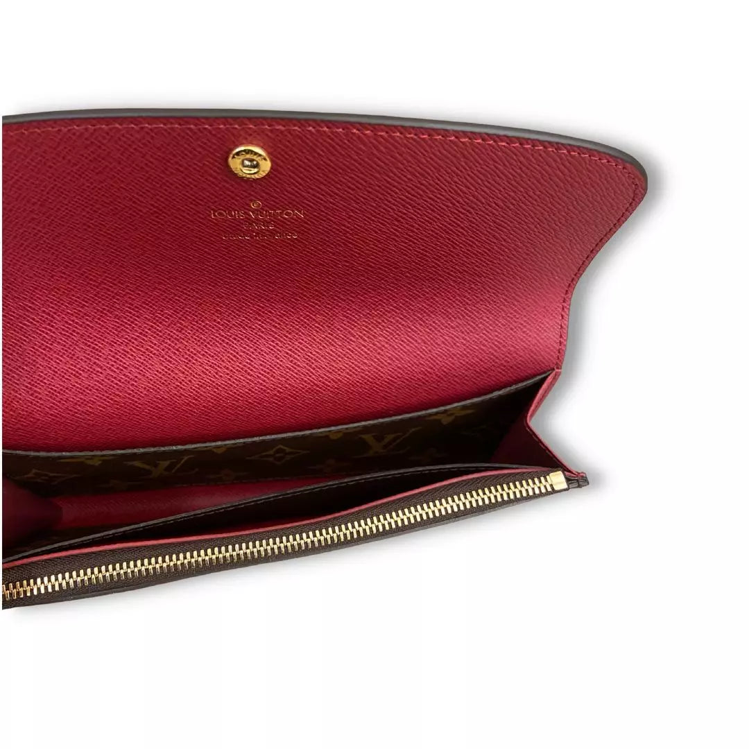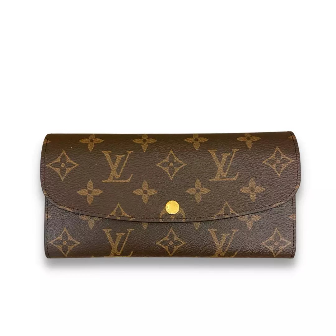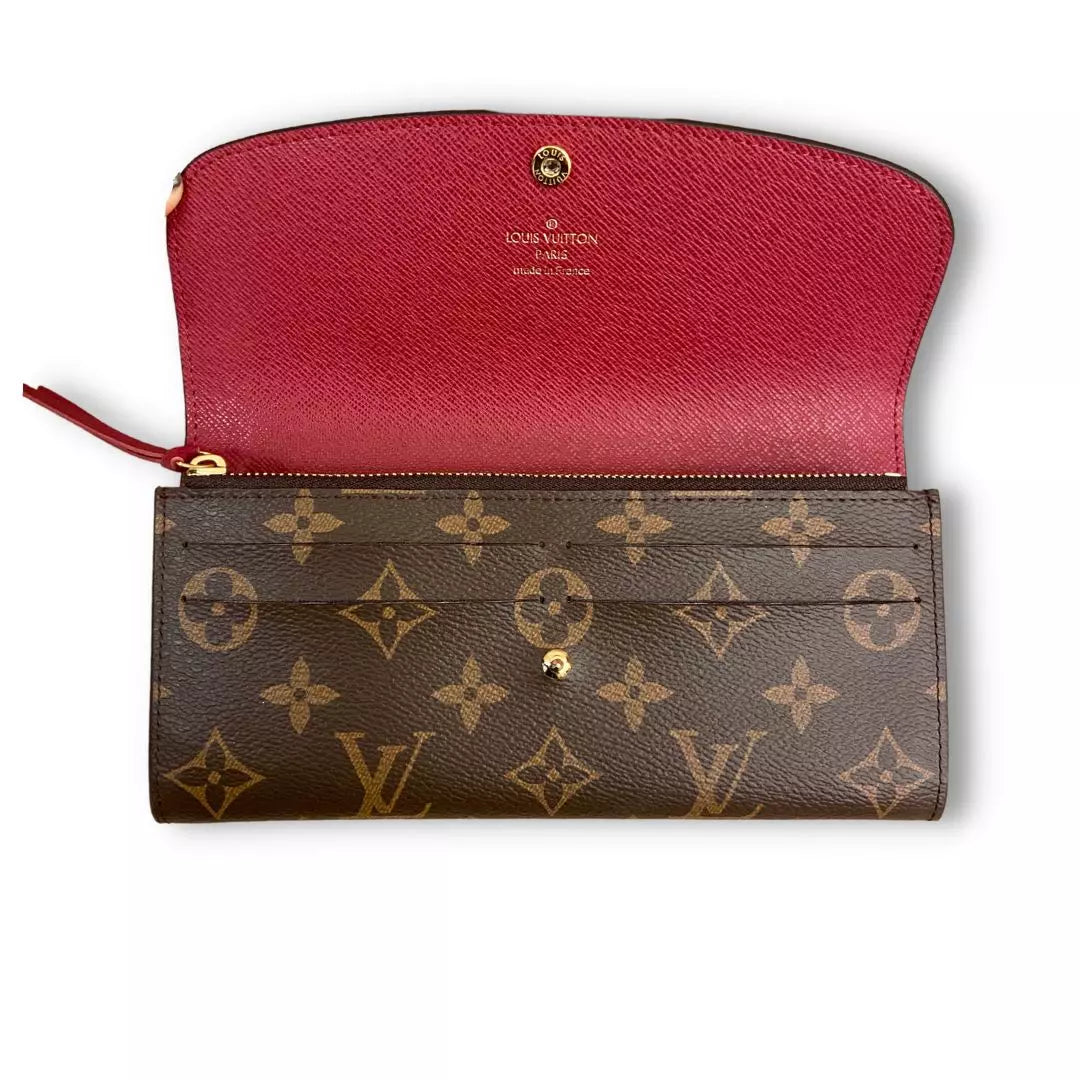 Louis Vuitton Brown Leather Emilie Wallet in coated canvas. It boasts 4 credit cards slots, 1 zipped coin pocket, 2 large inside flat pockets & 1 large gusseted compartment.