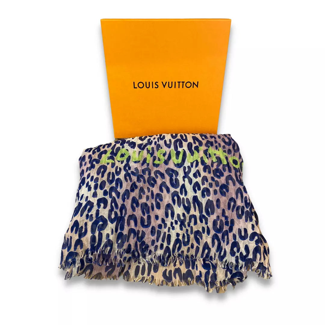 Pre-Loved Louis Vuitton Leopard Cashmere Scarf. It features an iconic leopard print designed by Stephen Sprouse, enhanced with a graffiti-esque Louis Vuitton signature. Made in 70% cashmere and 30% silk.