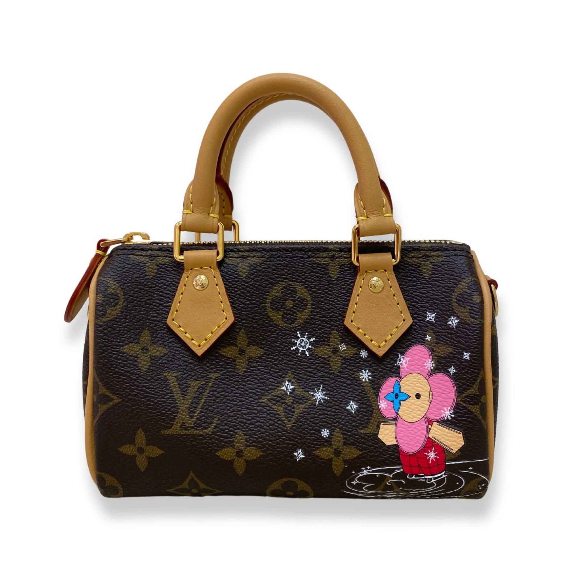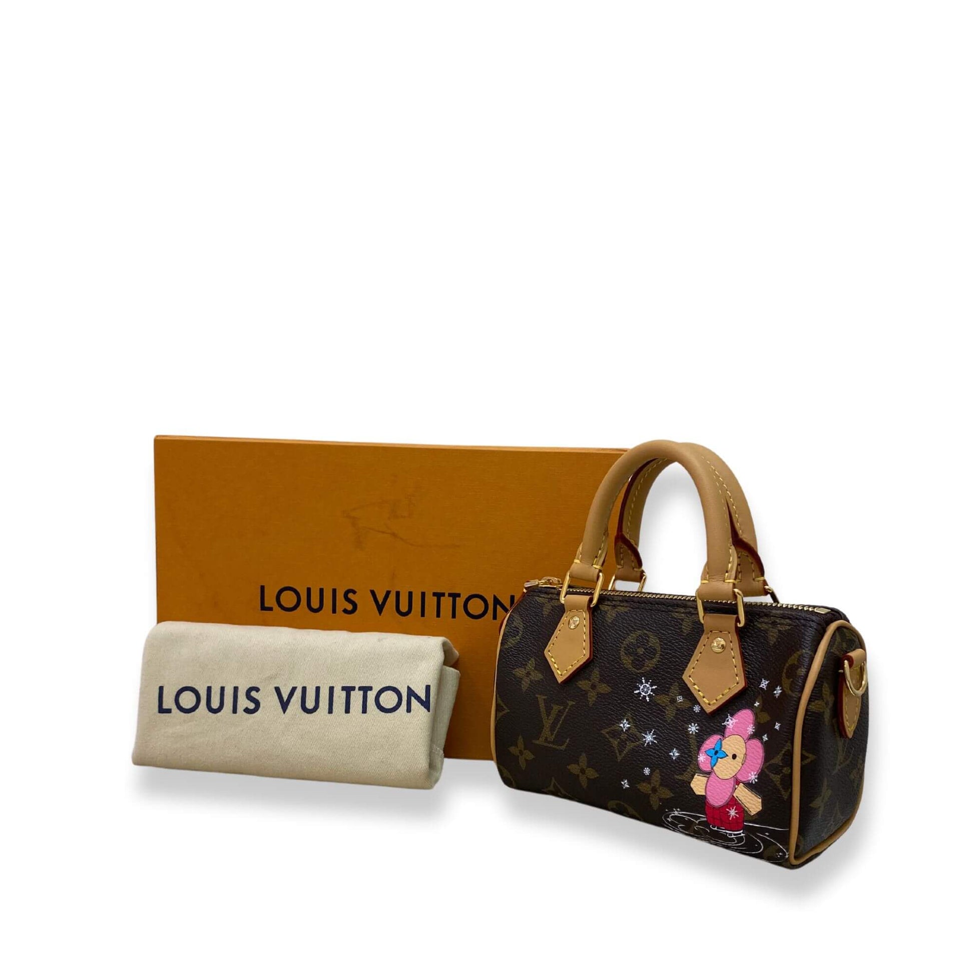 This NEW Louis Vuitton Nano Speedy Vivienne is a Christmas Limited edition bag made with LV's iconic monogram in leather. It has a design of the Maison mascot ice skating, making it a distinguished piece. Reference is M82624.