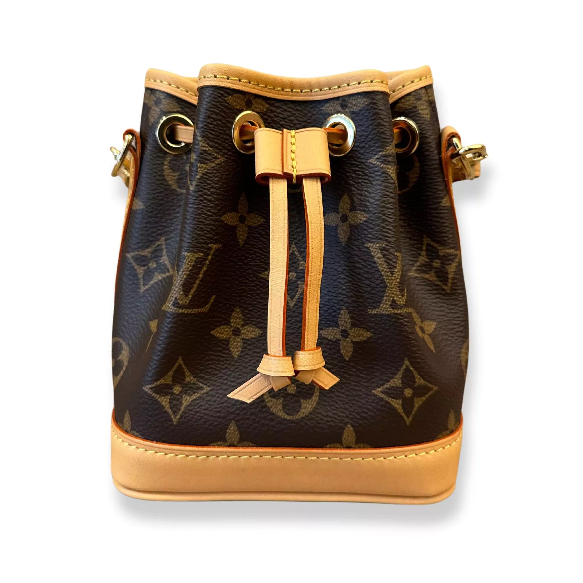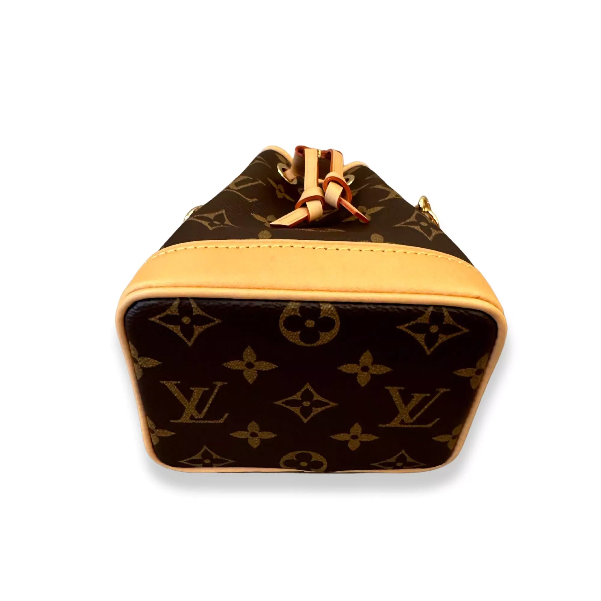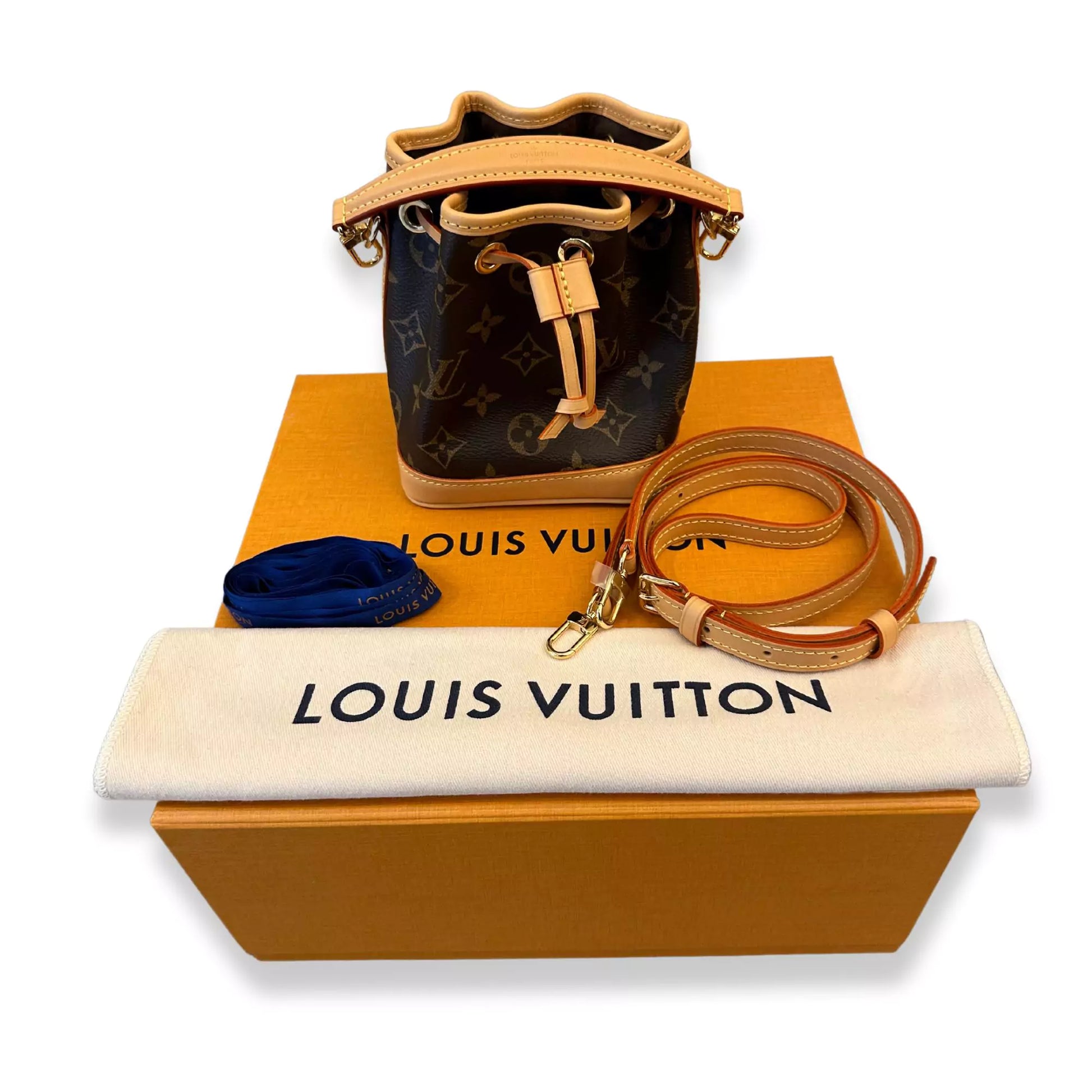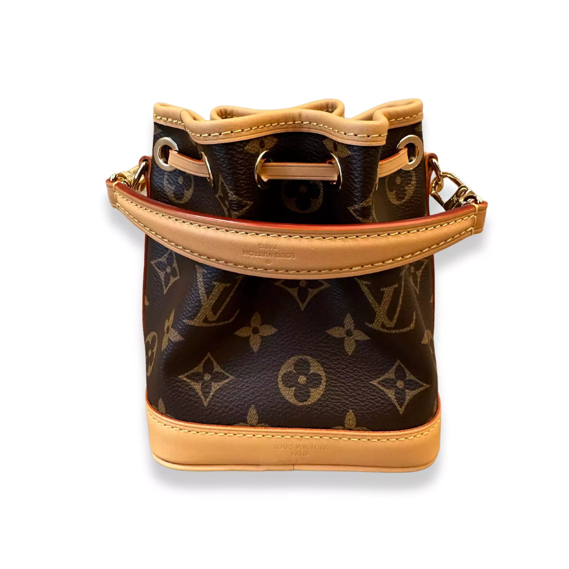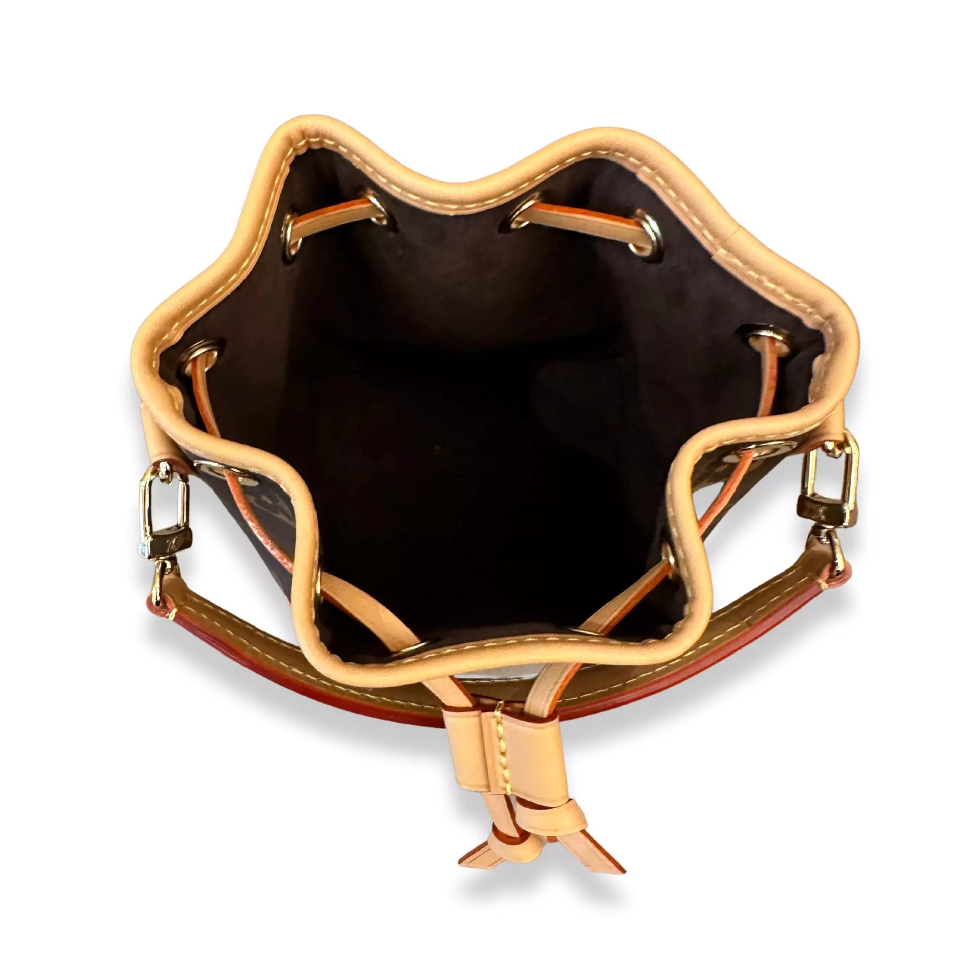 The Nano Noé bag, a miniature version of the iconic Noé created in 1932, is made from Monogram canvas with natural leather trims. Reference M81266