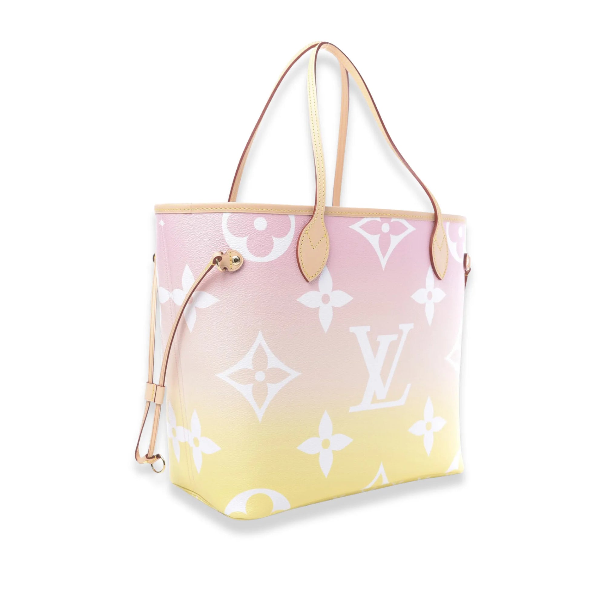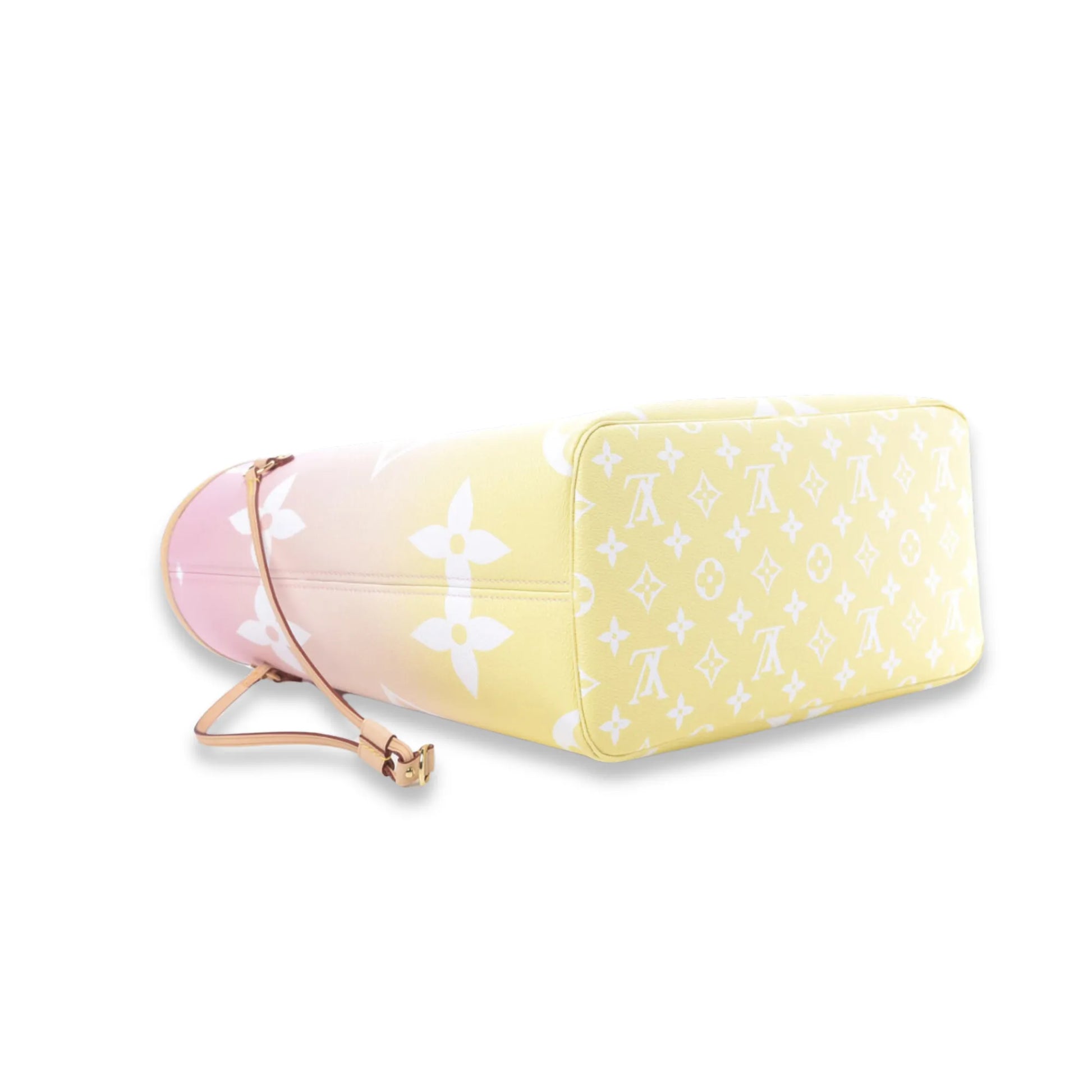 This LV Monogram Giant By The Pool Neverfull MM in Light Pink is crafted of classic Louis Vuitton monogram coated canvas in an ombre pink to yellow contrast. The bag features vachetta cowhide leather shoulder straps, trim and side cinch cords, with polished brass hardware. The wide top is open to a striped light pink fabric interior with a zipper pocket.