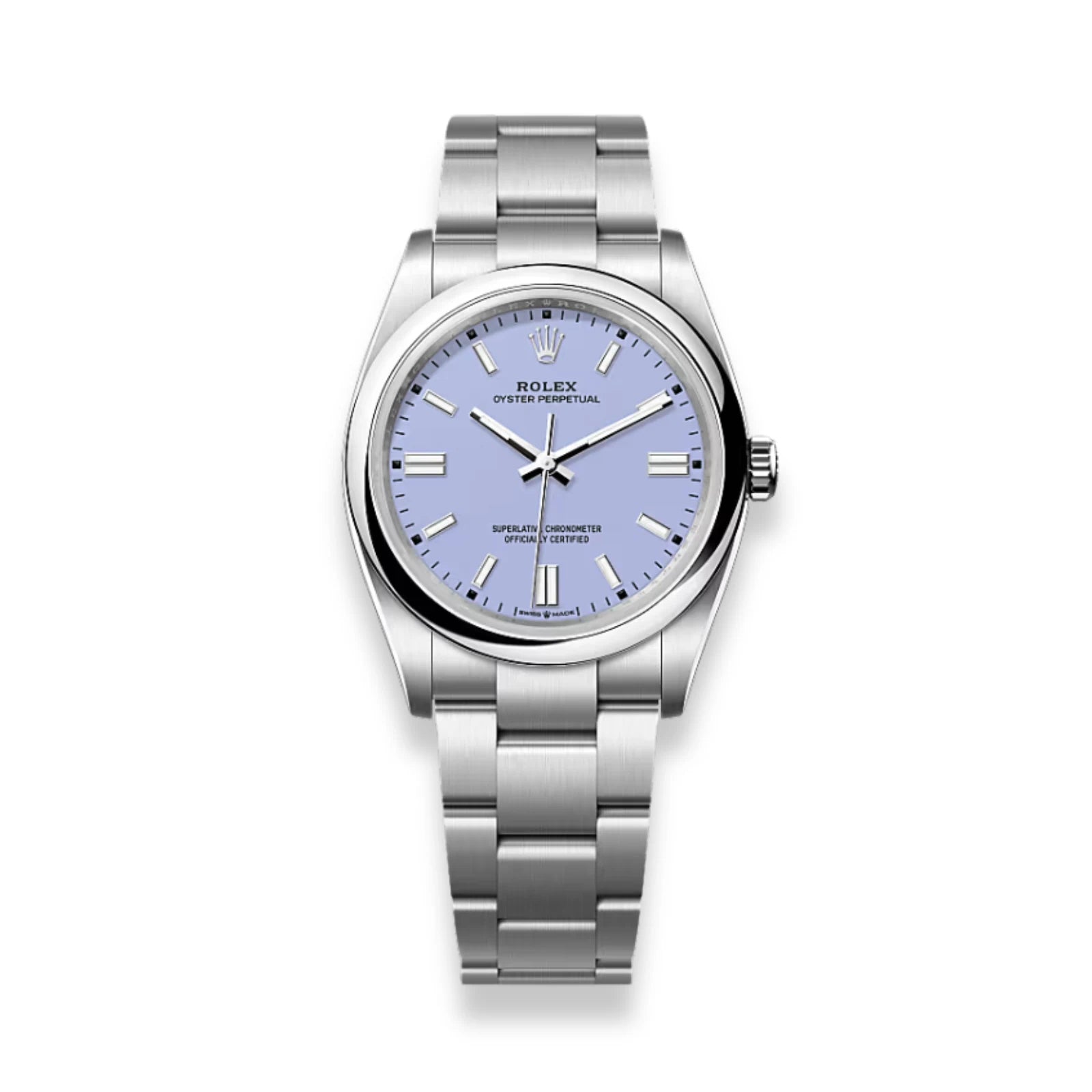 This Rolex President Oyster Perpetual Watch is made all of Oystersteel. The Oyster Perpetual 36 with a lavender dial and an Oyster bracelet.
