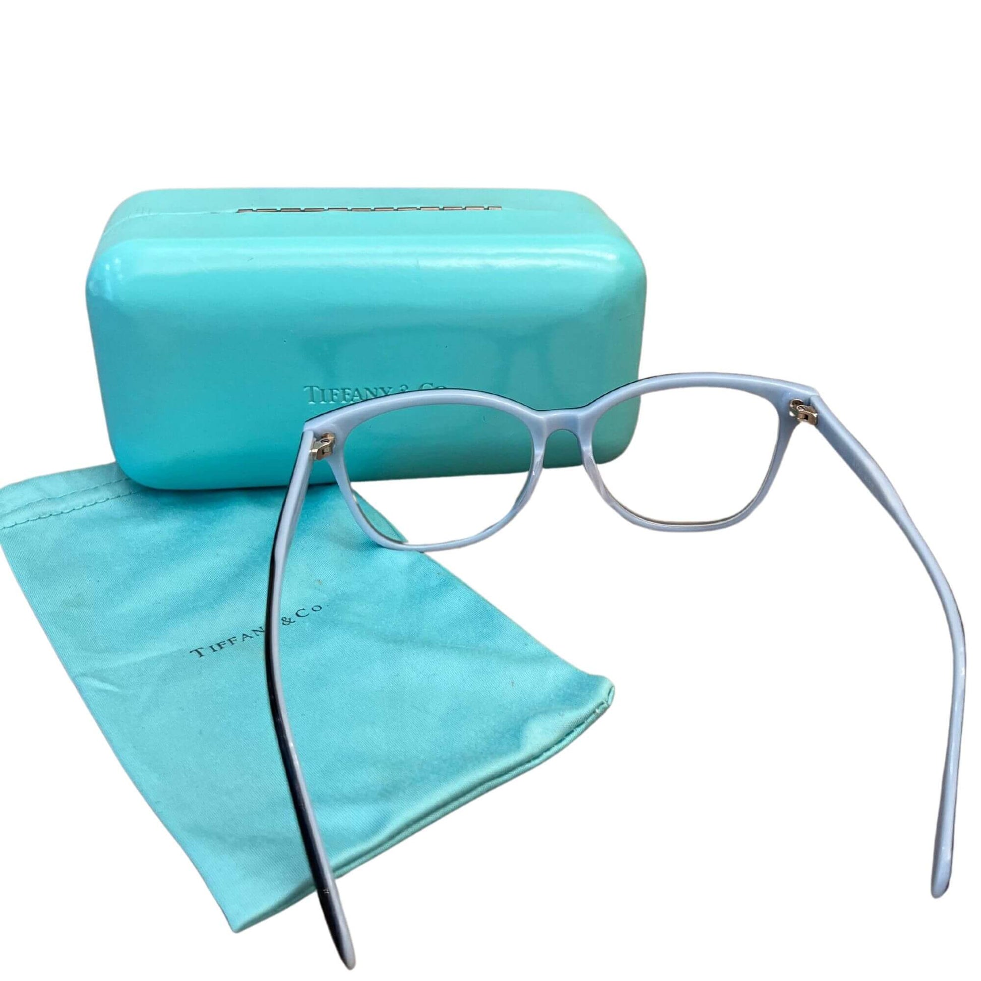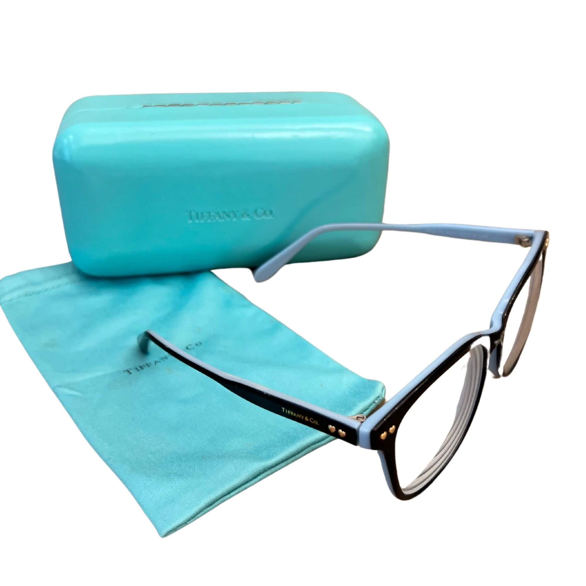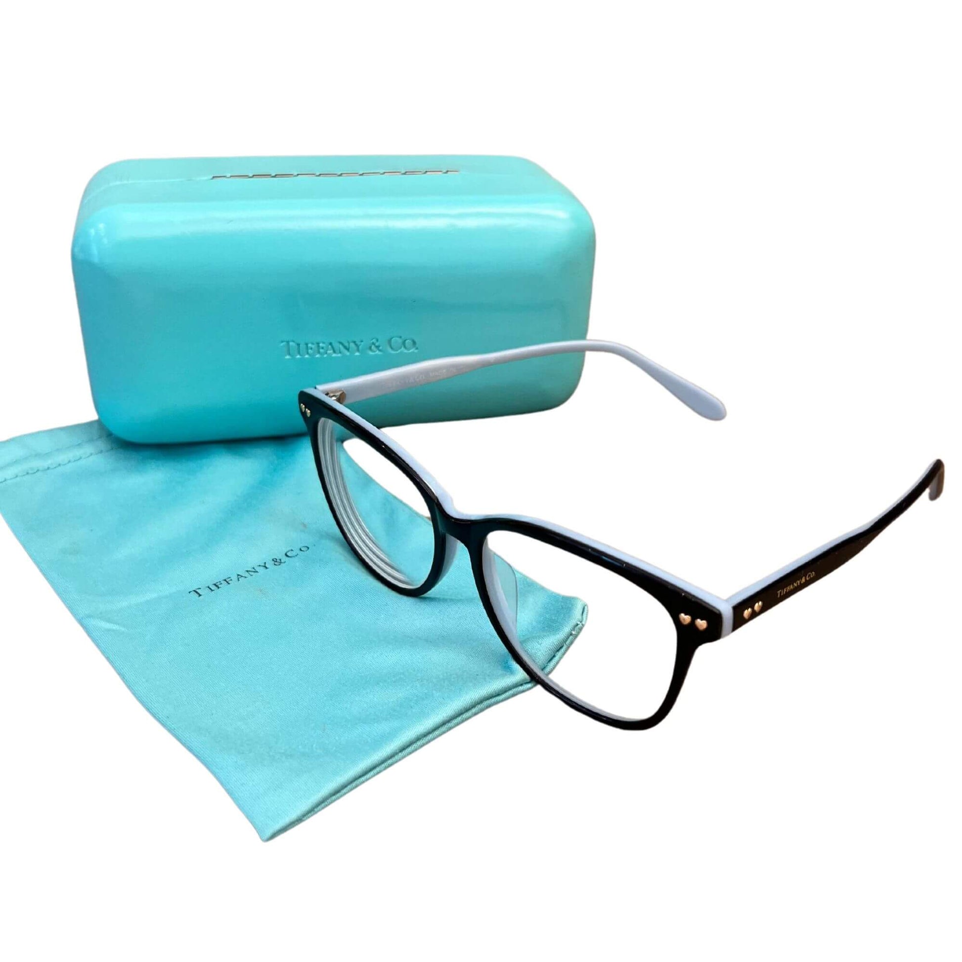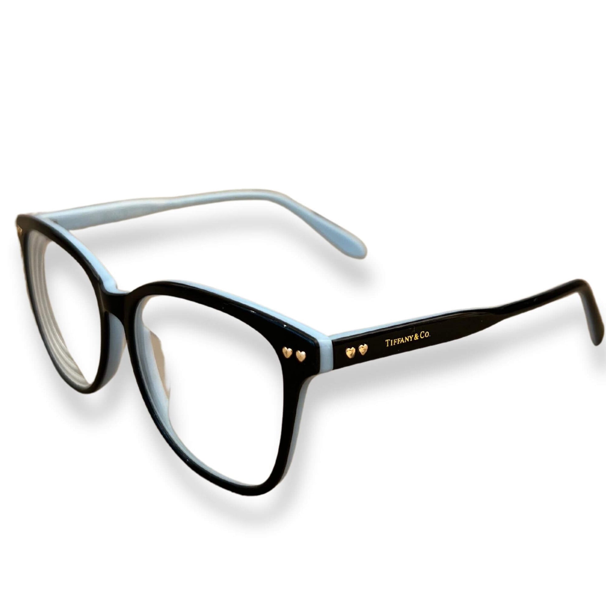 These PRE-LOVED Tiffany & Co eyeglasses are made out of black acetate with the inside made out of the same material in the iconic Tiffany Blue. They have a rectangular shape with two golden colored hearts in the sides and the Tiffany & Co name engraved on the glasses temple.