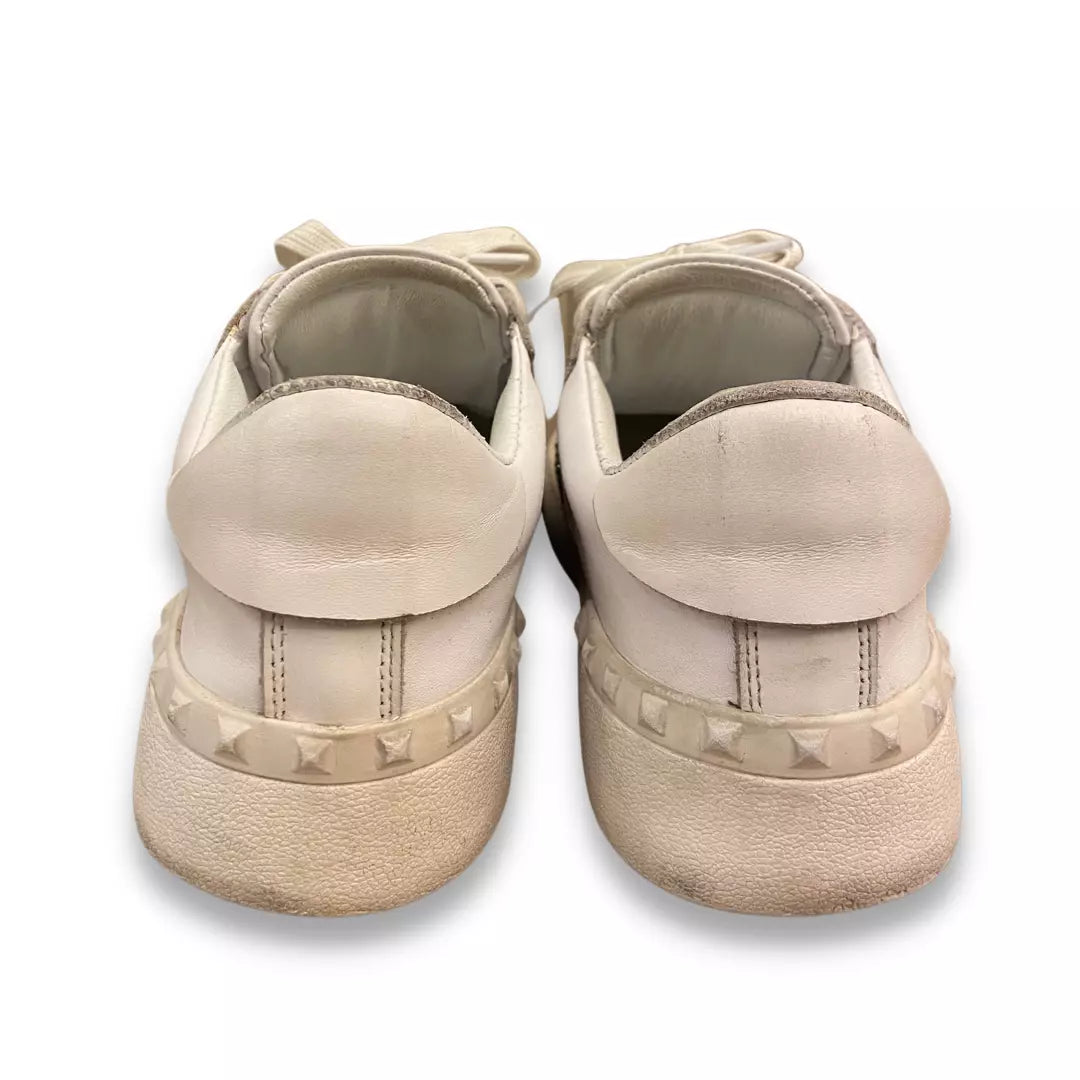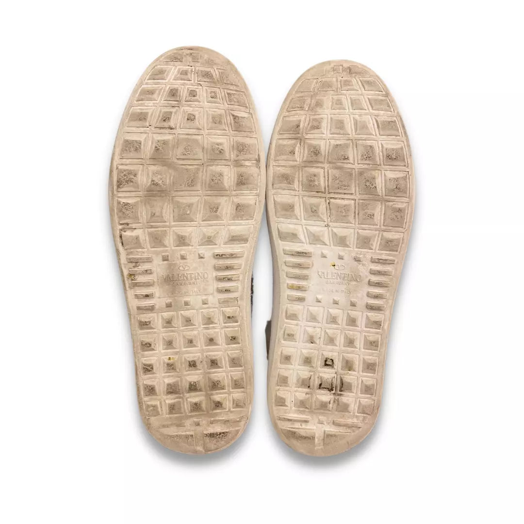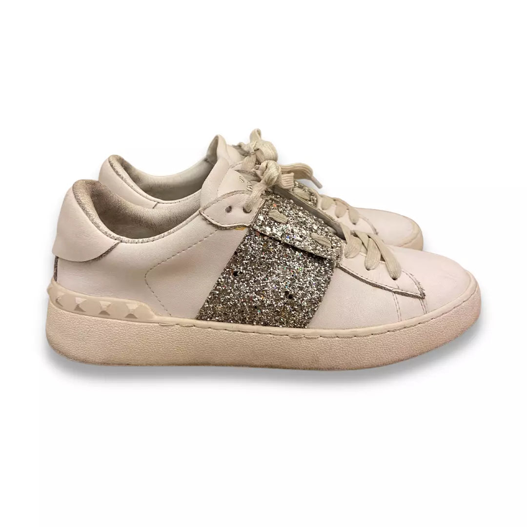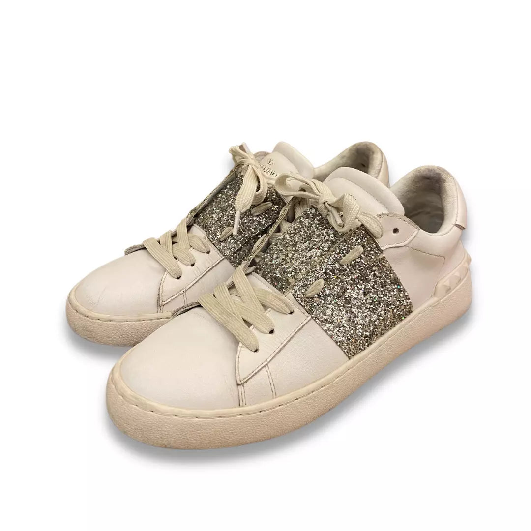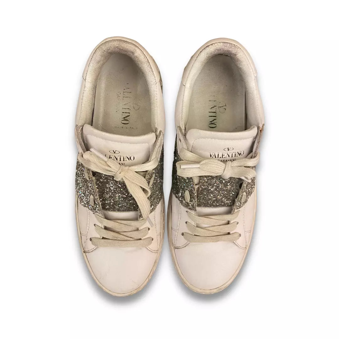 These Pre-Loved Valentino Silver Open Glitter Sneaker In White Leather & Glitter Band With Rubber Rockstuds Lace-Up Closure are in Good Condition.