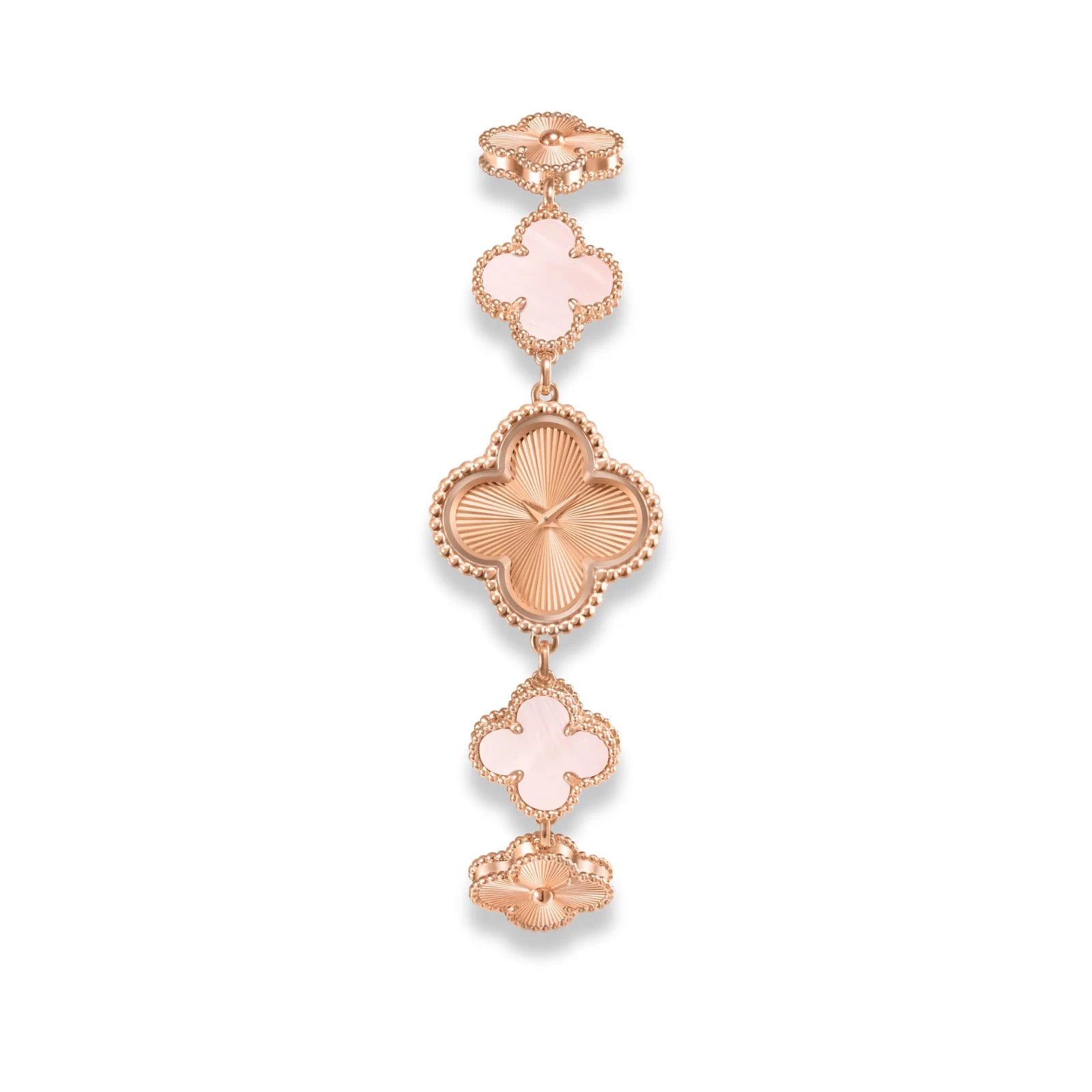 This New Sweet Alhambra watch, features pink gold case with a pink gold bezel. It is adorned with a white mother-of-pearl dial and a pink gold bracelet set with round diamonds and white mother-of-pearl. Diamonds are DEF color, ranging from IF to VVS clarity. Powered by a quartz movement.